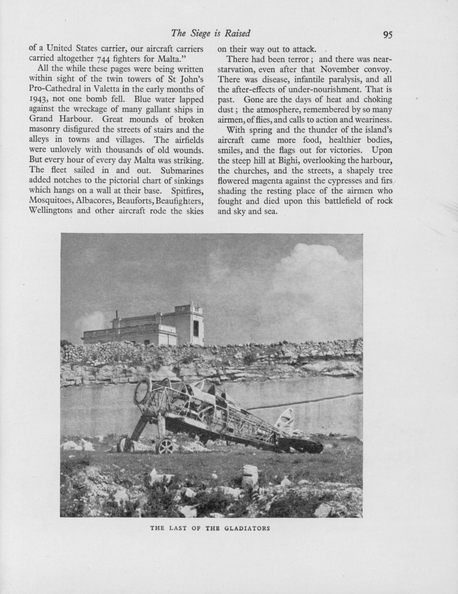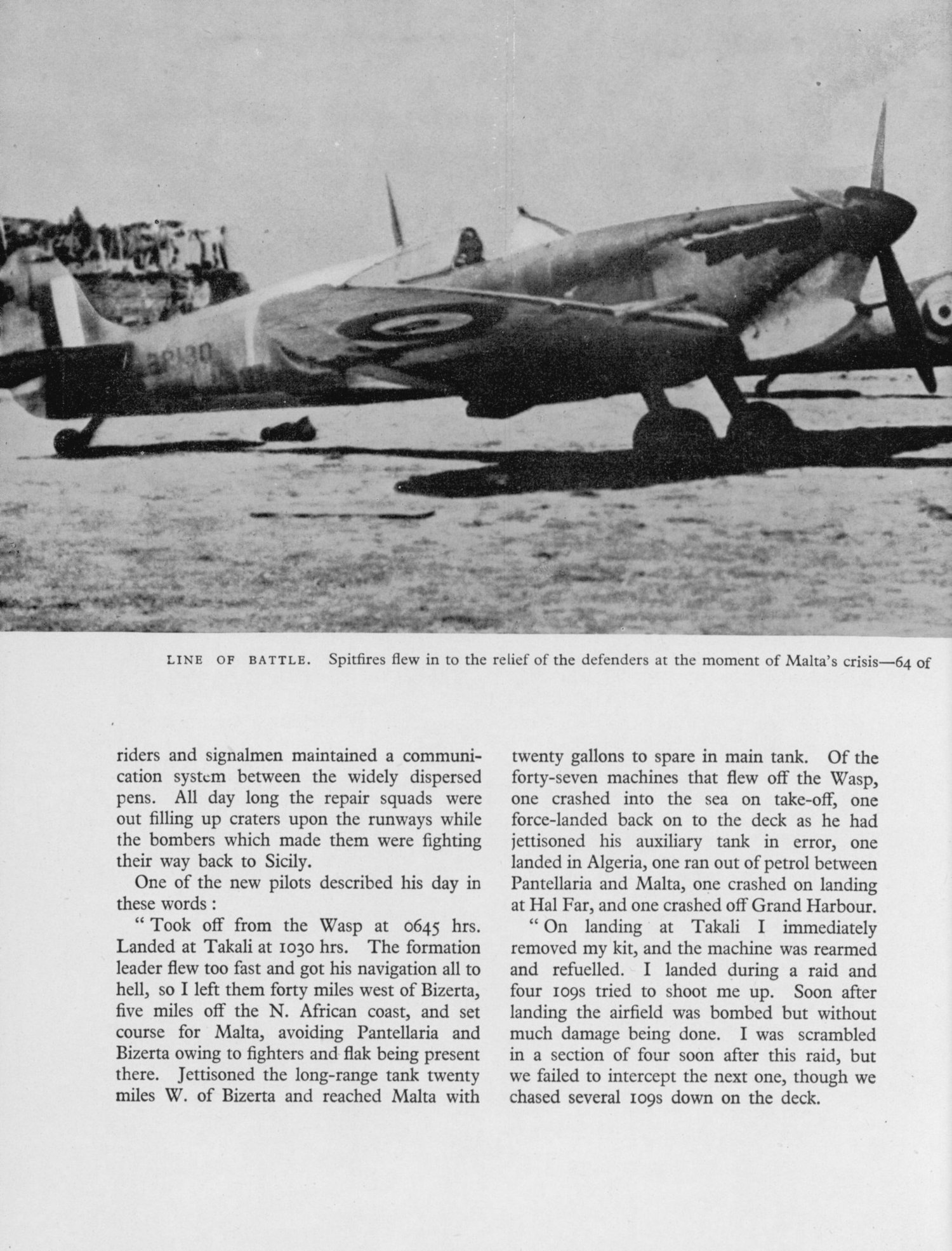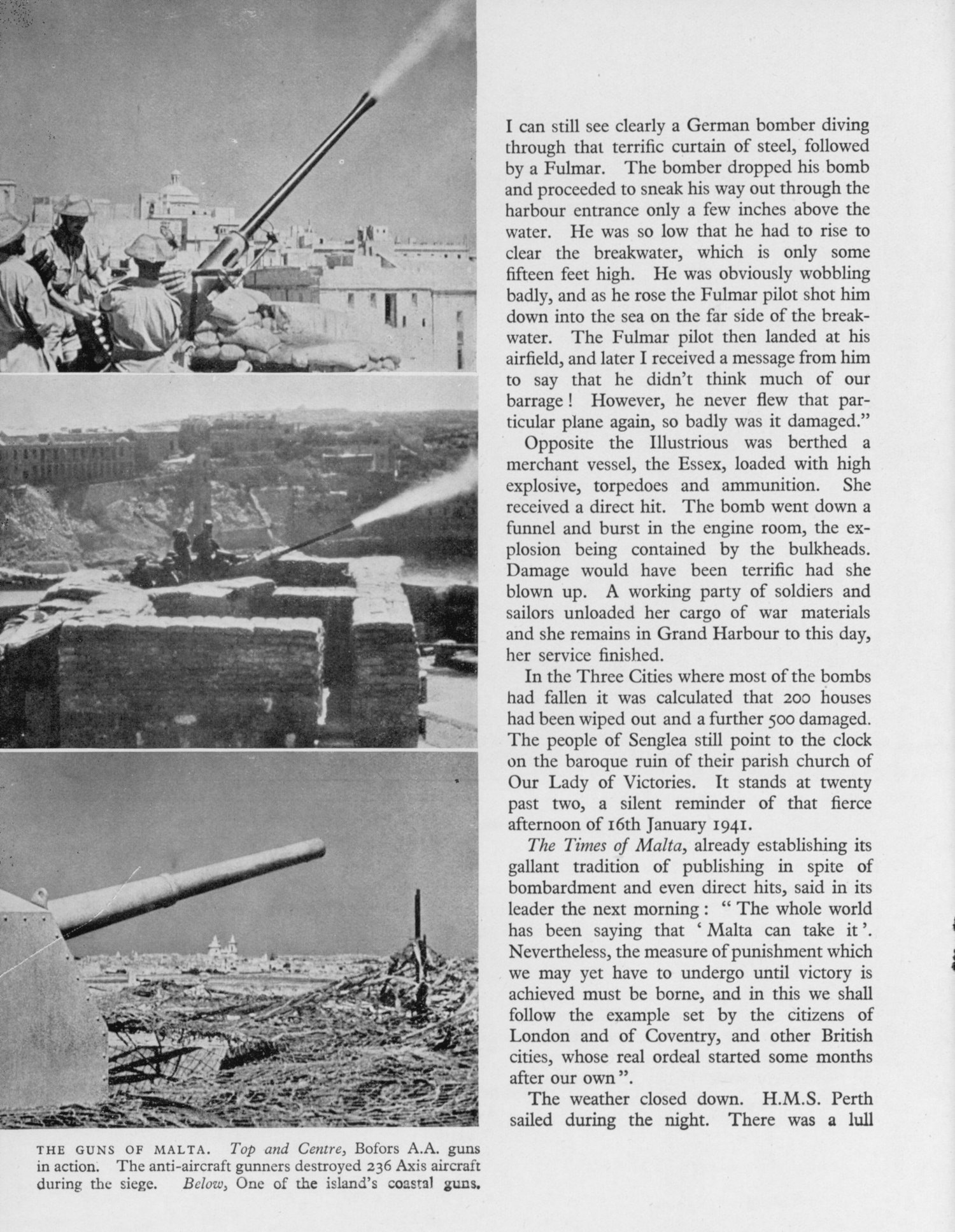 Aircraft and submarines from the island, with perseverance and daring worthy of the traditions of the Knights of St John, ravaged the enemy’s supplies. Malta-based aircraft alone sank or damaged over half a million tons of his shipping. The island’s reconnaissance aircraft sought and brought news of the enemy in Italy, Sicily, North Africa and the Greek Archipelago. Malta was always linked with the fortunes of the armies in the Western Desert. Never in history was the island’s strategical significance greater.