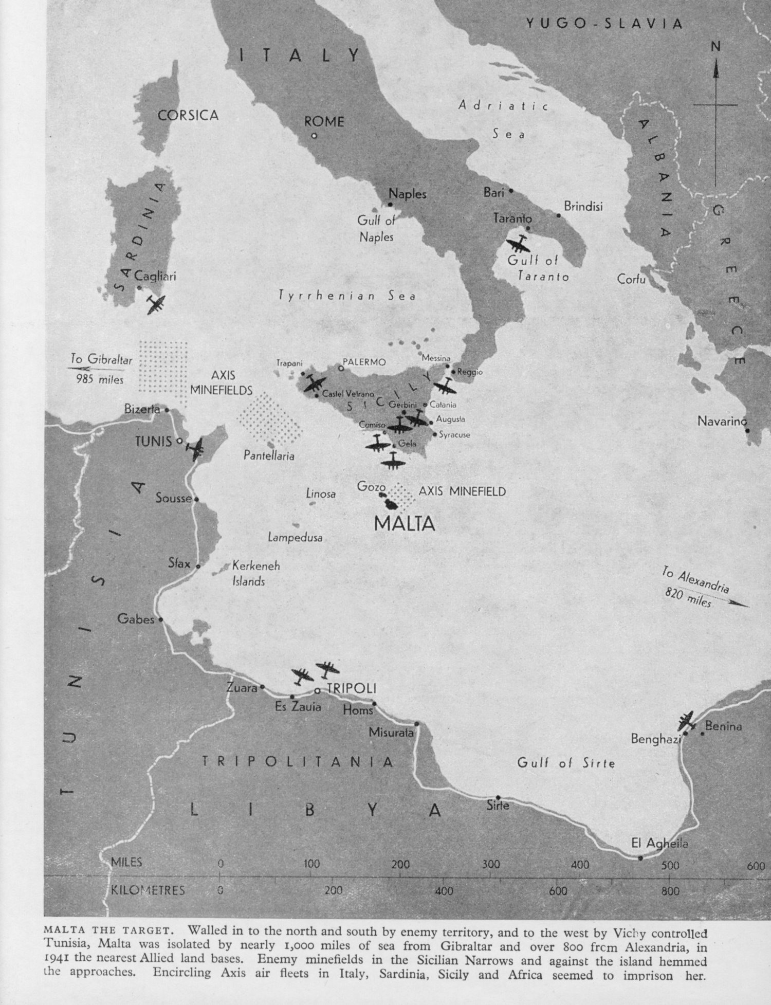 The island was not a single weapon wielded as an isolated arm ; it had an integral part to play in Mediterranean strategy as a whole. Malta is linked by air with both extremes of the Middle Sea—with Gibraltar and Egypt. Every theatre of war in the Mediterranean was within range of its aircraft, and not the least important task of its pilots was to watch from their central position all the movements of the enemy. The battles in the Mediterranean hinged upon supplies, on the capacity of both sides to reinforce themselves across a limited area of sea and across desert sand. The geographical situation of the island was vital to the Allies in the supply conflict: but for Malta, Rommel in 1942 might well have pressed on to Alexandria.