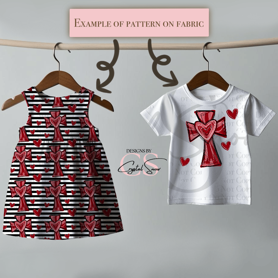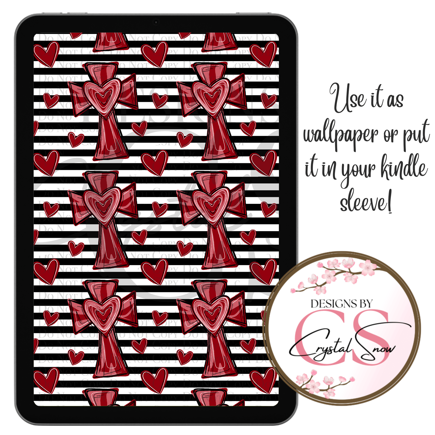 Striped Cross of Love is a hand-drawn seamless repeat pattern featuring layered red hearts forming a cross over high-contrast black and white stripes. Graphic, dramatic, and unapologetically bold, this design is perfect for Valentine projects that lean modern, edgy, or faith-inspired without feeling dated.