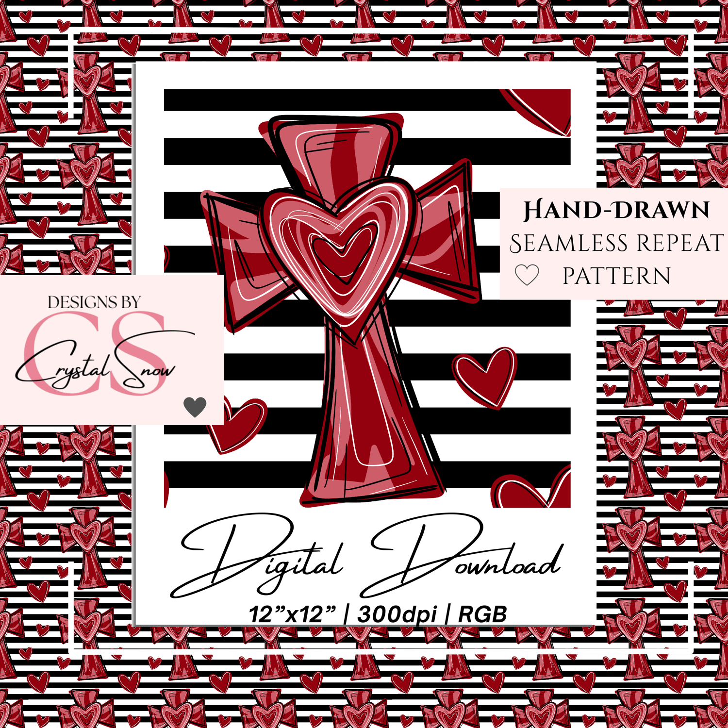 Striped Cross of Love Seamless Pattern | Valentine Cross Hearts | Hand Drawn 12x12 Digital Paper