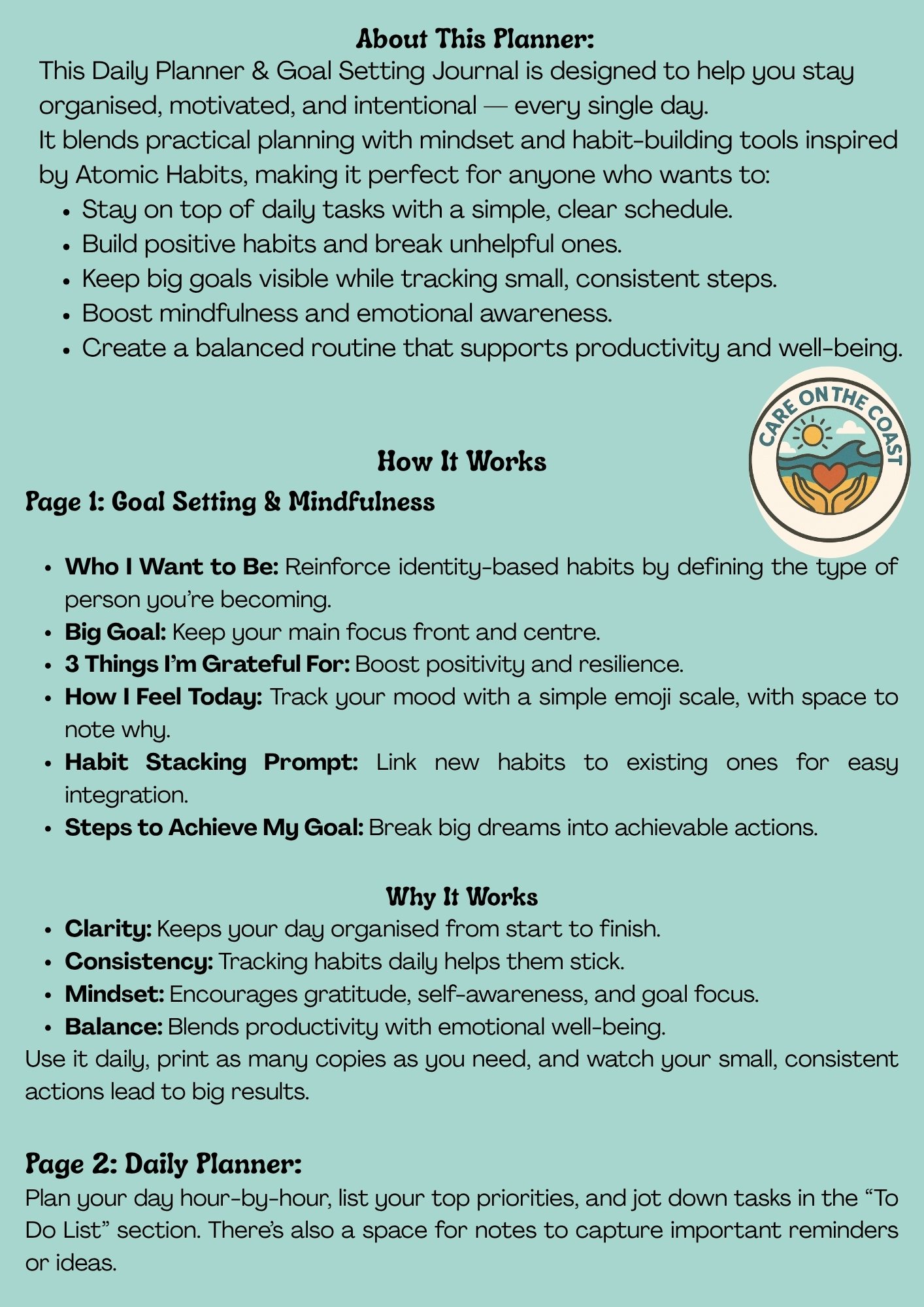Stay consistent, build better habits, and reach your goals with this 63-page Daily Planner & Goal Tracker. Inspired by the principles of Atomic Habits, this planner is designed to help you take small, intentional steps each day that lead to lasting change. Inside, you’ll find structured pages to track habits, set clear goals, plan your day, and reflect on your progress.