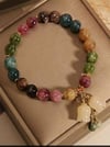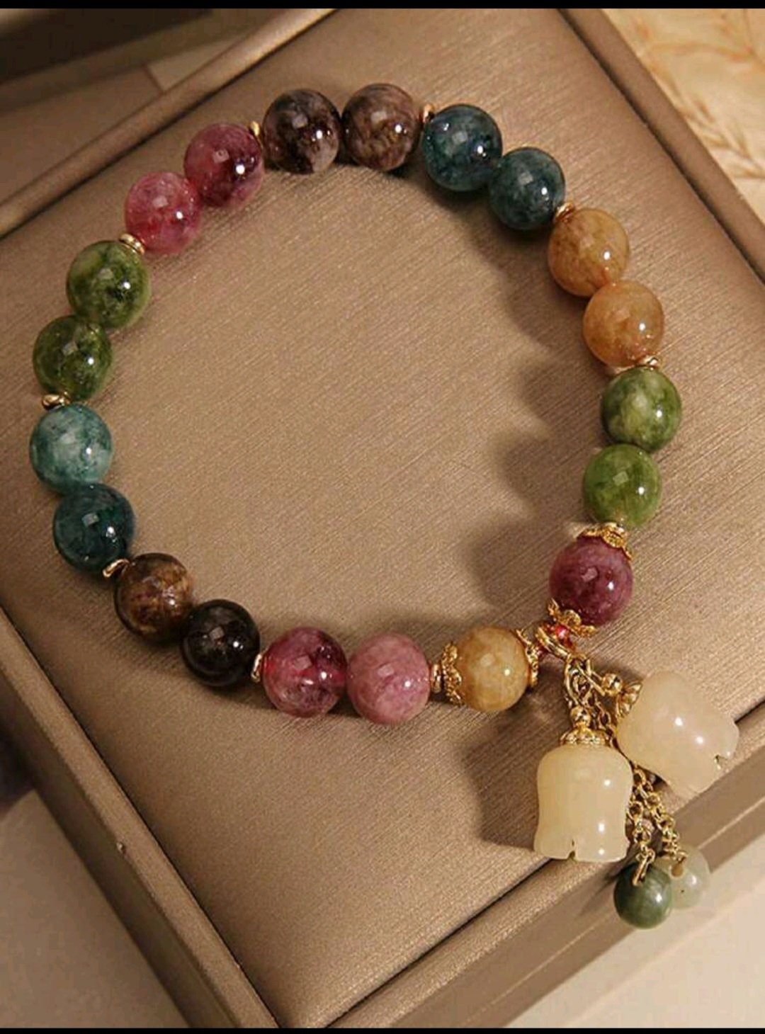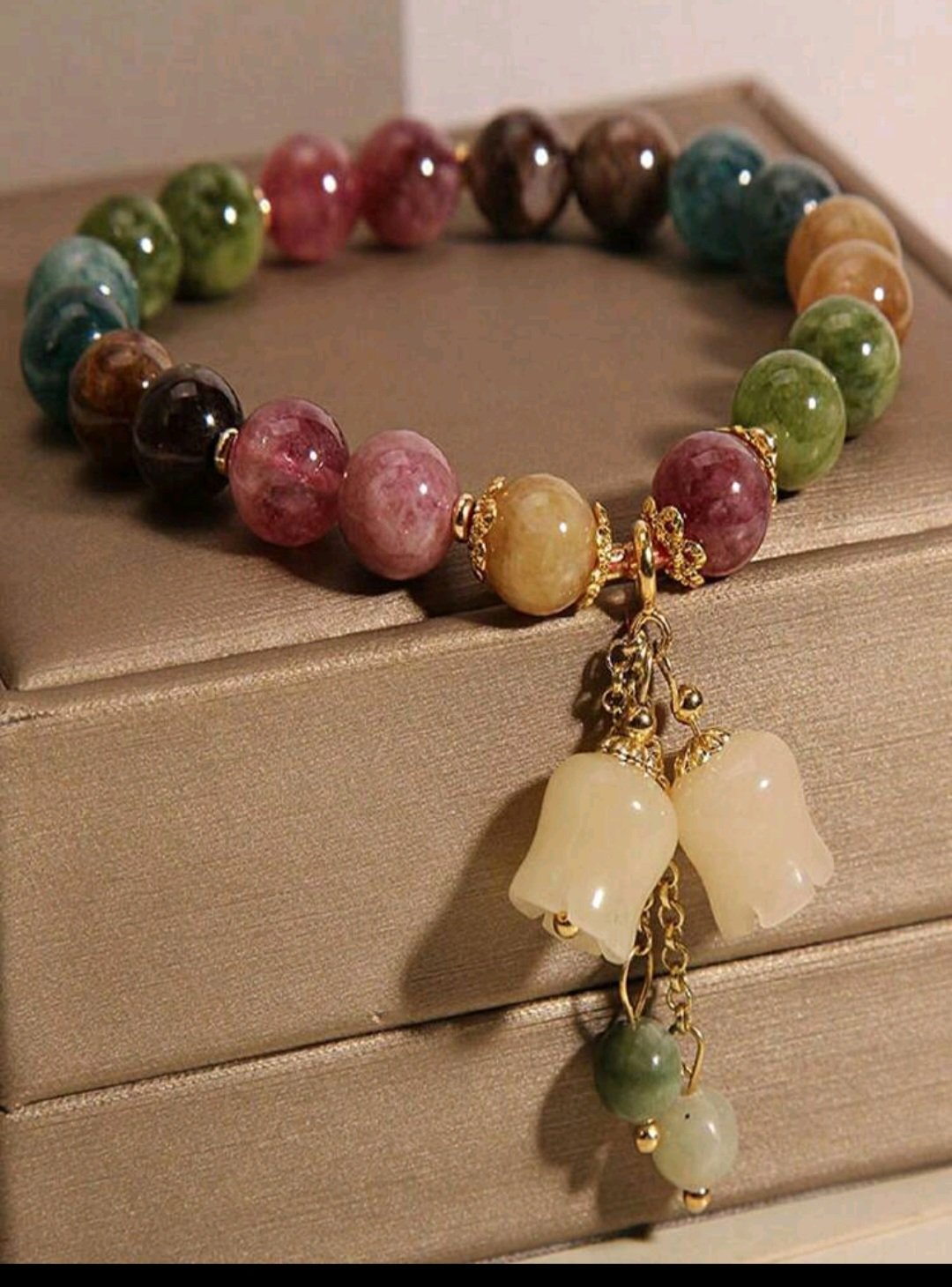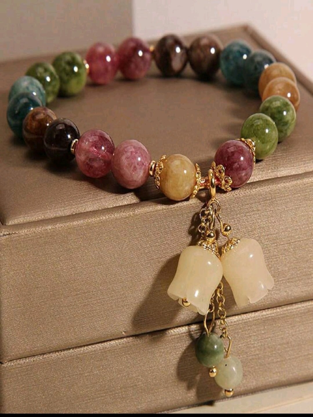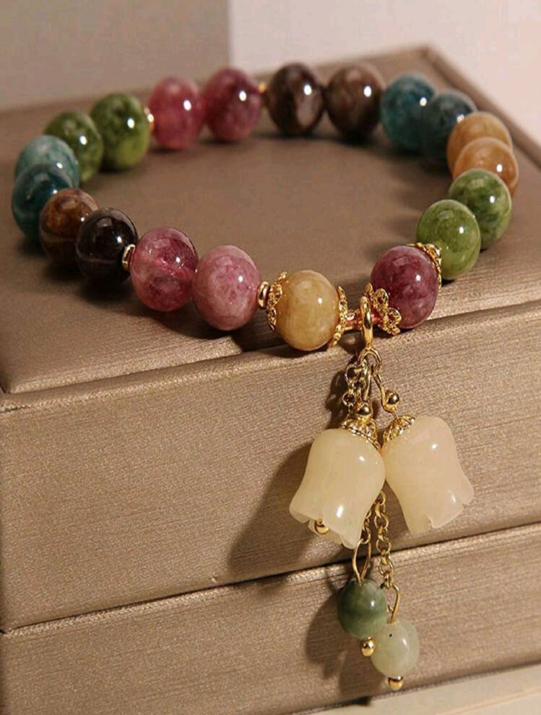1pc Natural Multi-Colored Aquamarine Stone Bracelet With Bellflower Pendant For Women, Gift For Girlfriend Or Bestie