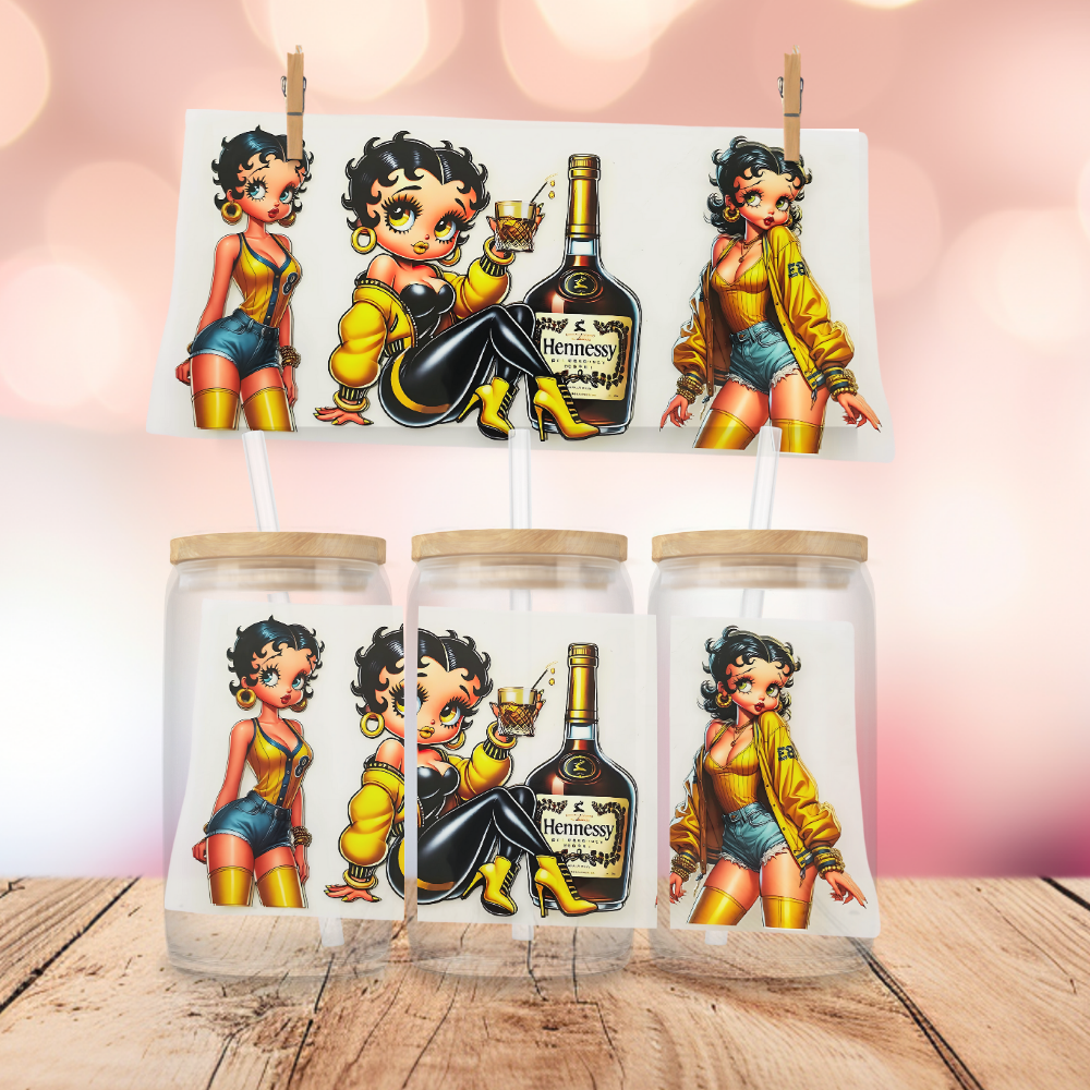 Turn up the glam and pop the bottle—Miss B is bringing the party! This fabulous wrap features Miss B holding a giant bottle and matching tumbler, giving full luxury vibes with a side of sass. Designed to fit 16 oz Libbey glass cups or tumblers, it’s the perfect pick for celebration cups, girls’ night gifts, or boutique drops that stand out.