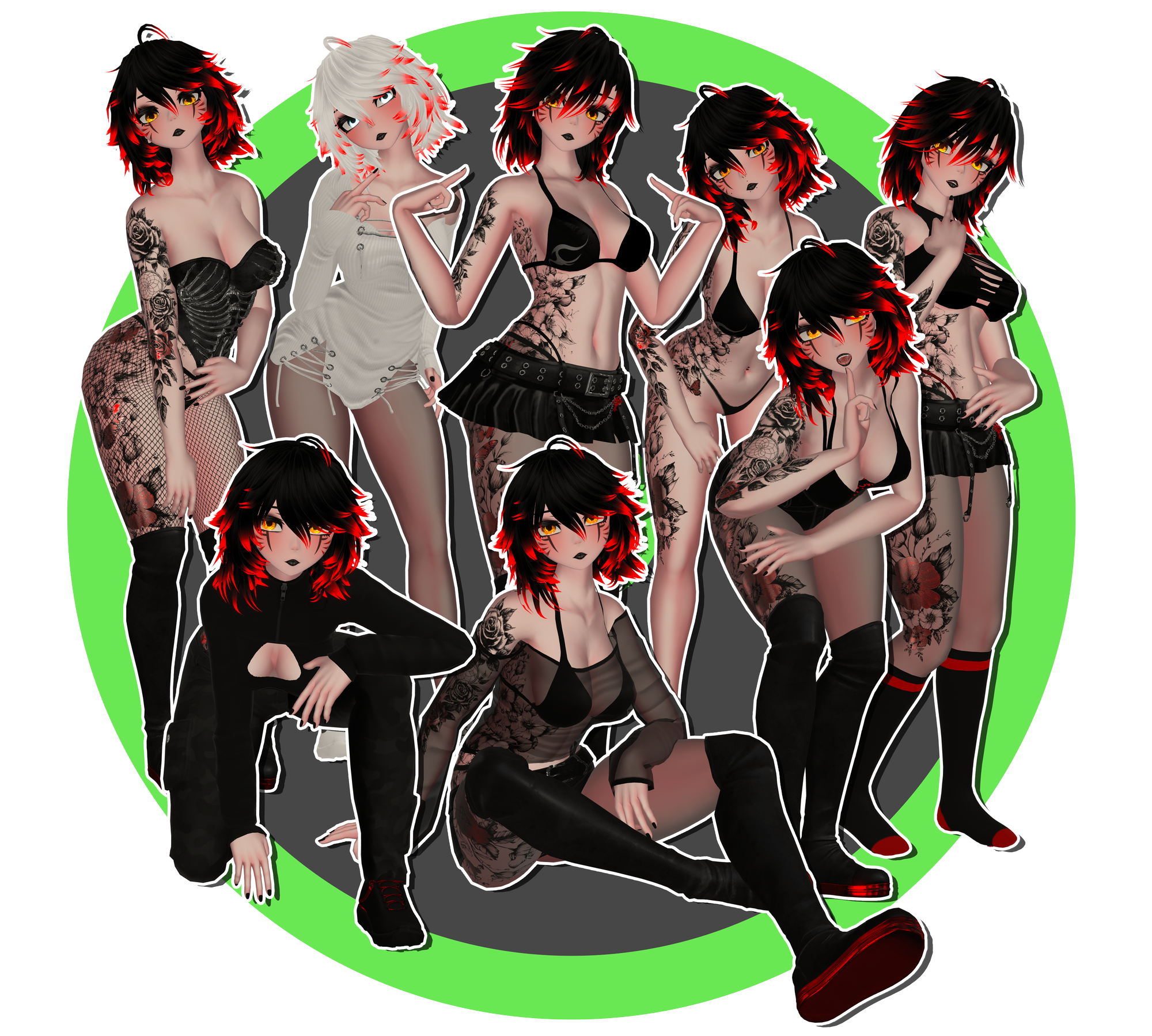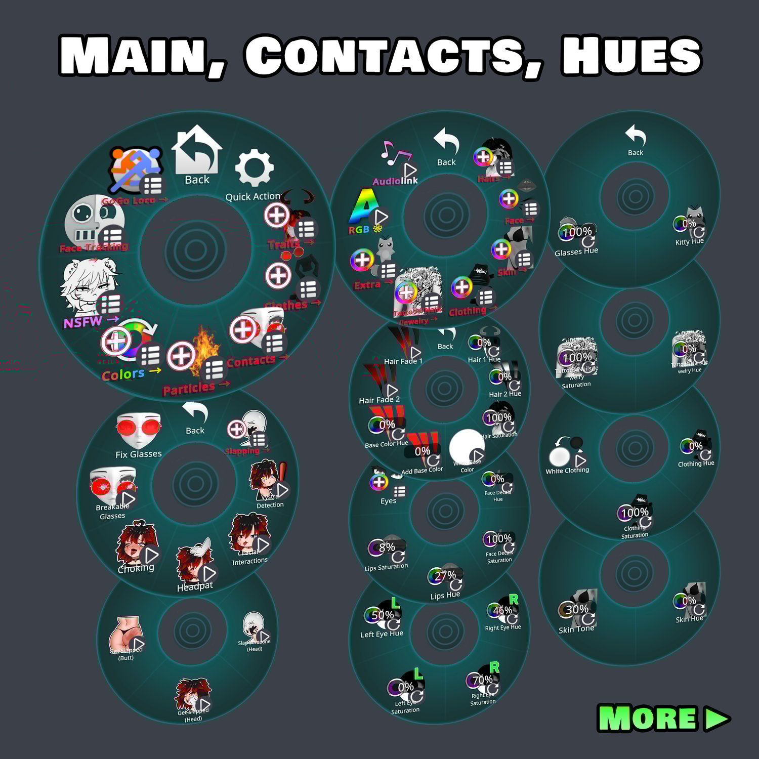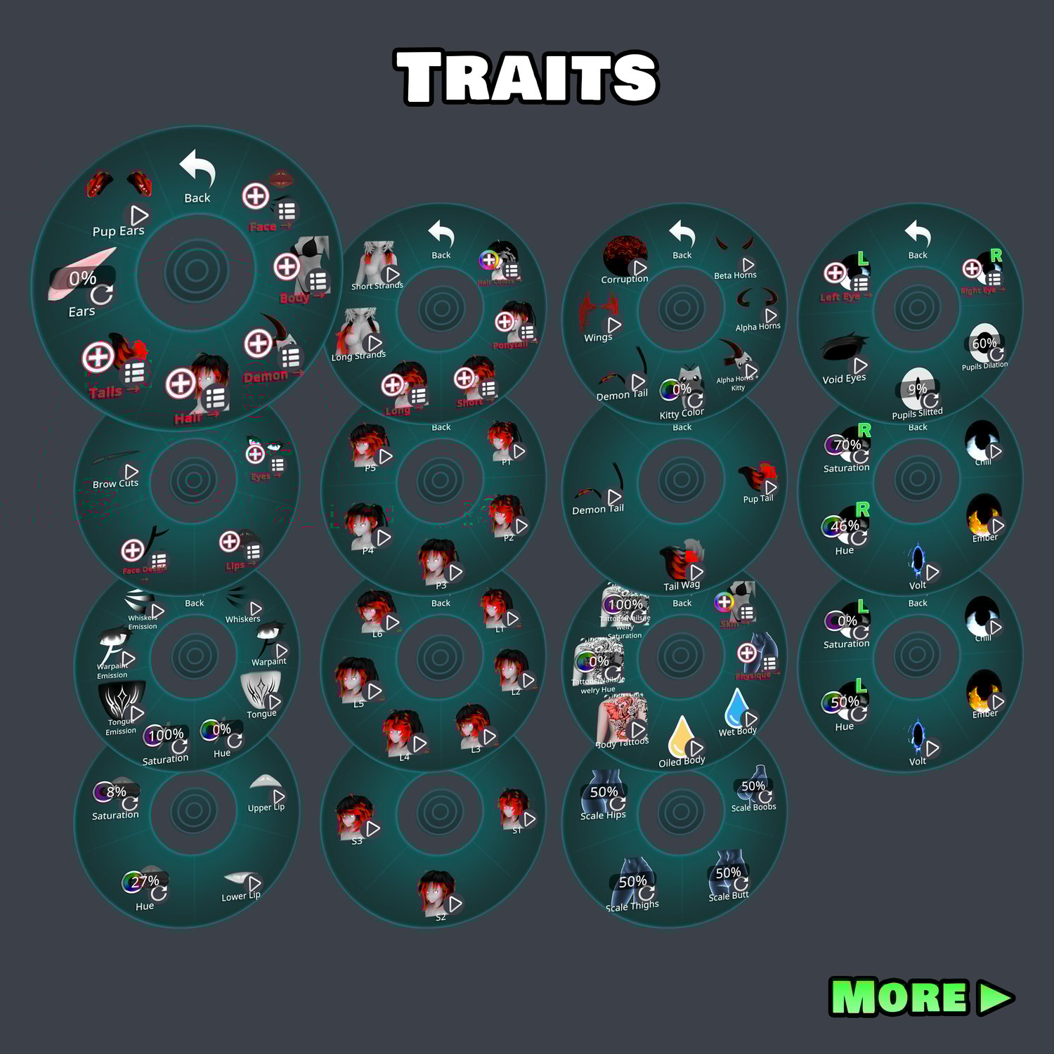 - Face toggles inc. Eyes, Lips (Upper and Lower), Decals (Marks, Whiskers, Tongue Tattoo+)
