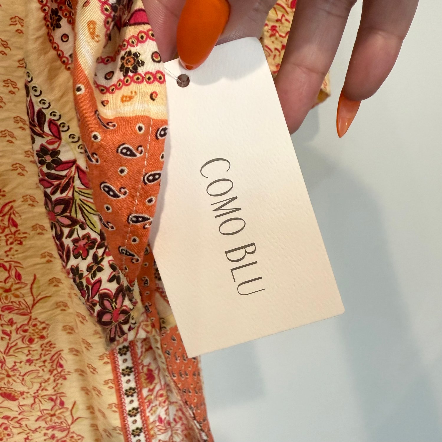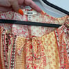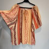 Como Blu lightweight multicolor short dolman sleeve blouse with a tie at the front, an elastic necklace so you can wear the blouse off shoulder and kind of a crepey texture.