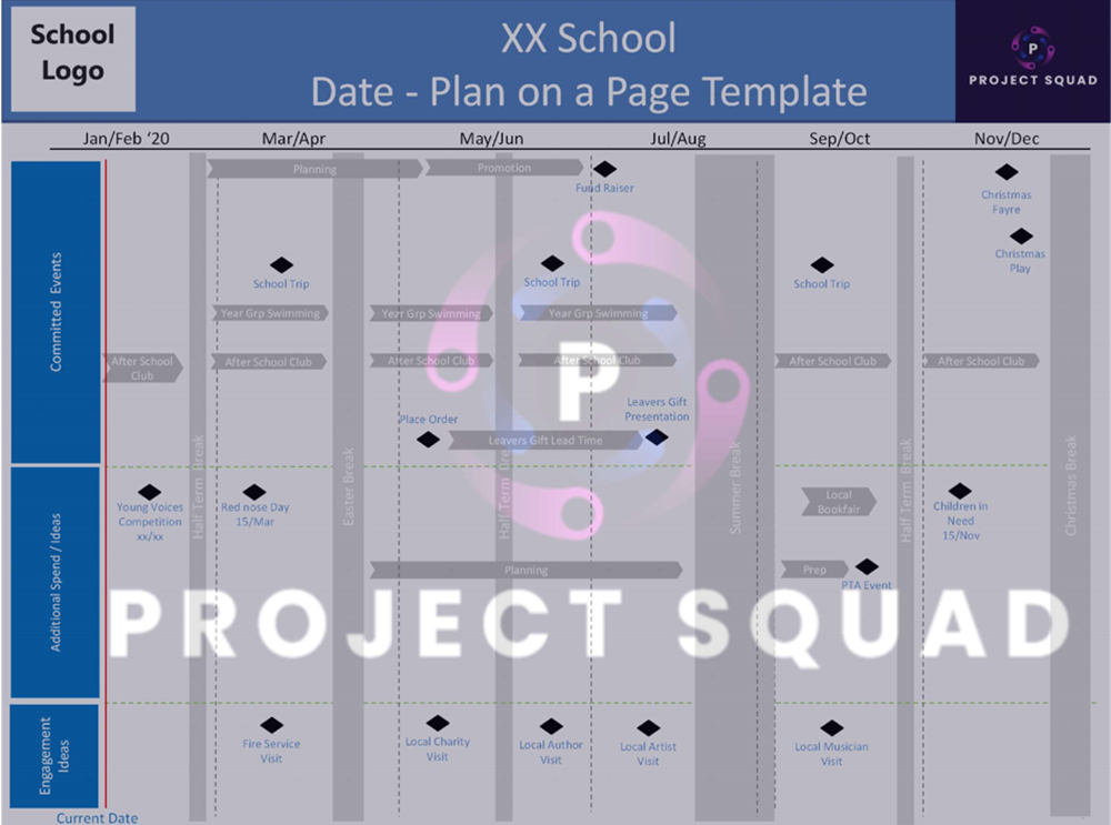 Ideal for inclusion in newsletters or on school noticeboards or as part of a PTA driven year plan, this plan on a page gives a simple, digestible view of the confirmed events and blocked holidays, a swim-lane for possible events and a final lane for additional events that could be introduced.