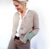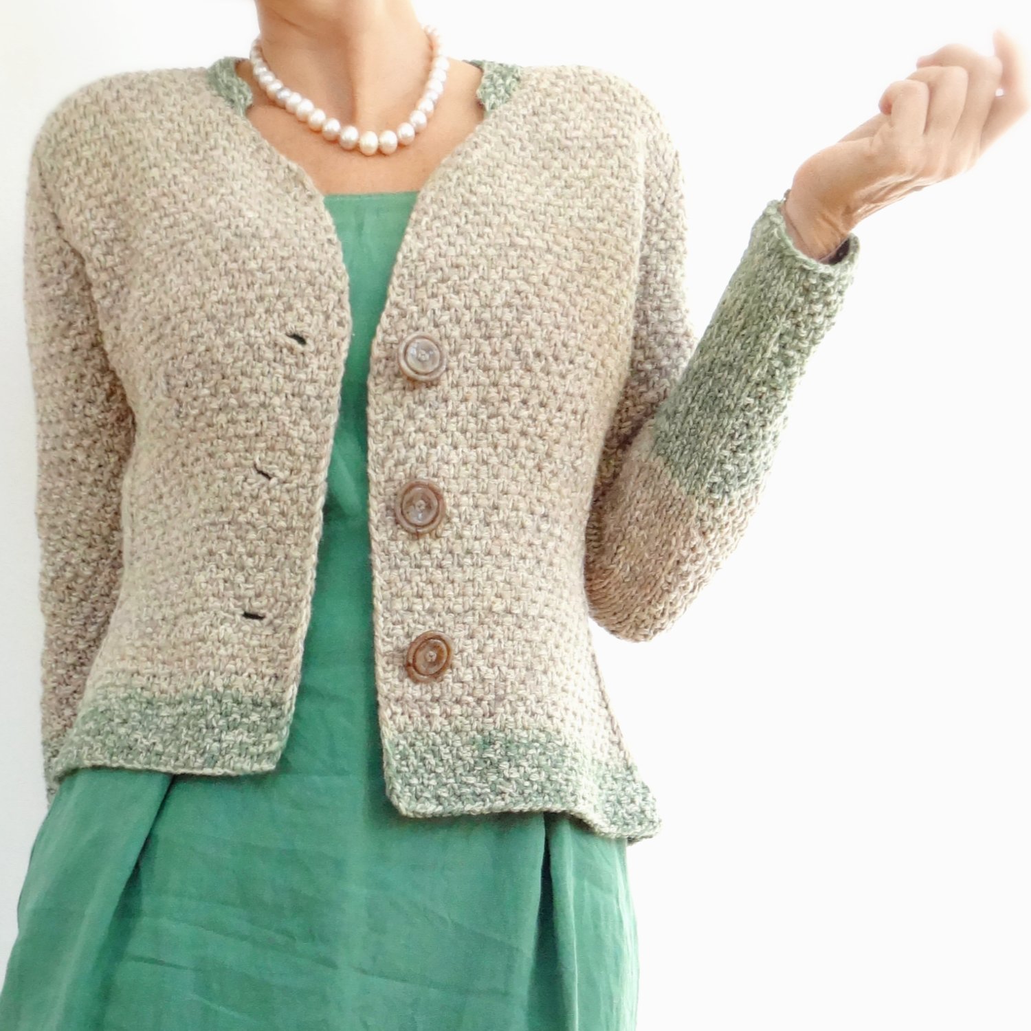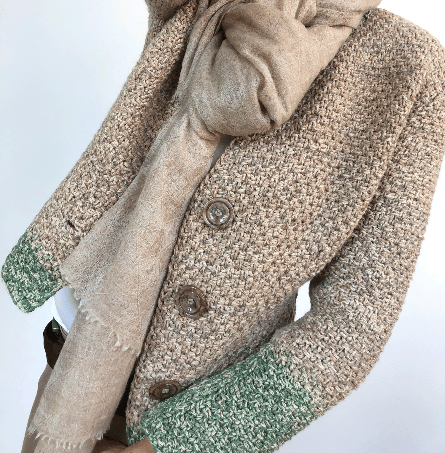This cardigan achieves the special tweed-effect by using several thin yarn threads in matching colours, the more the better. Use fingering and lace weight yarns and combine them to a unique texture. Glitter-yarn, shiny silk or fluffy yarns could add a special effect. Alternatively, you may use a thick tweed yarn single-stranded (approximately 70-80m/77-88yds per 50g).