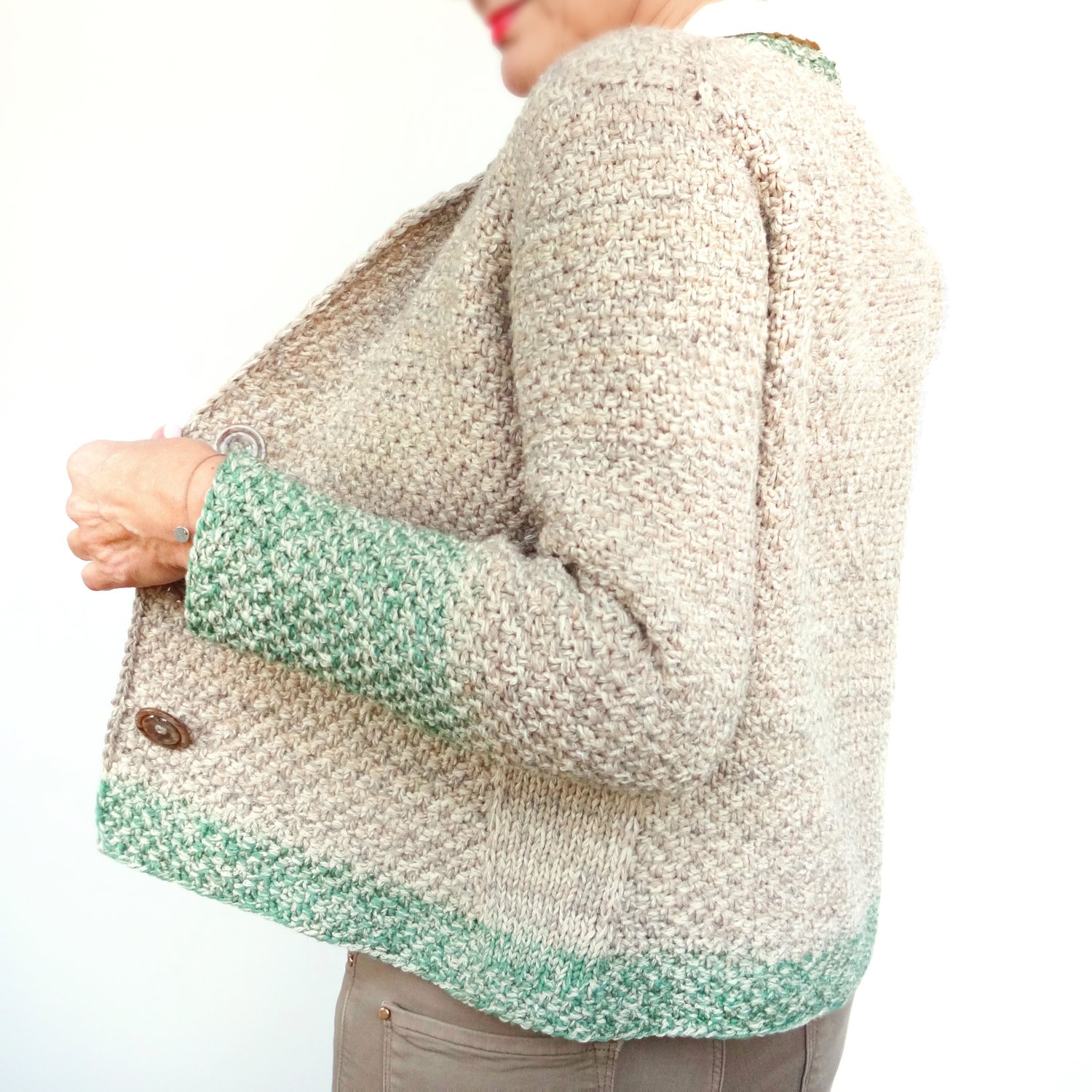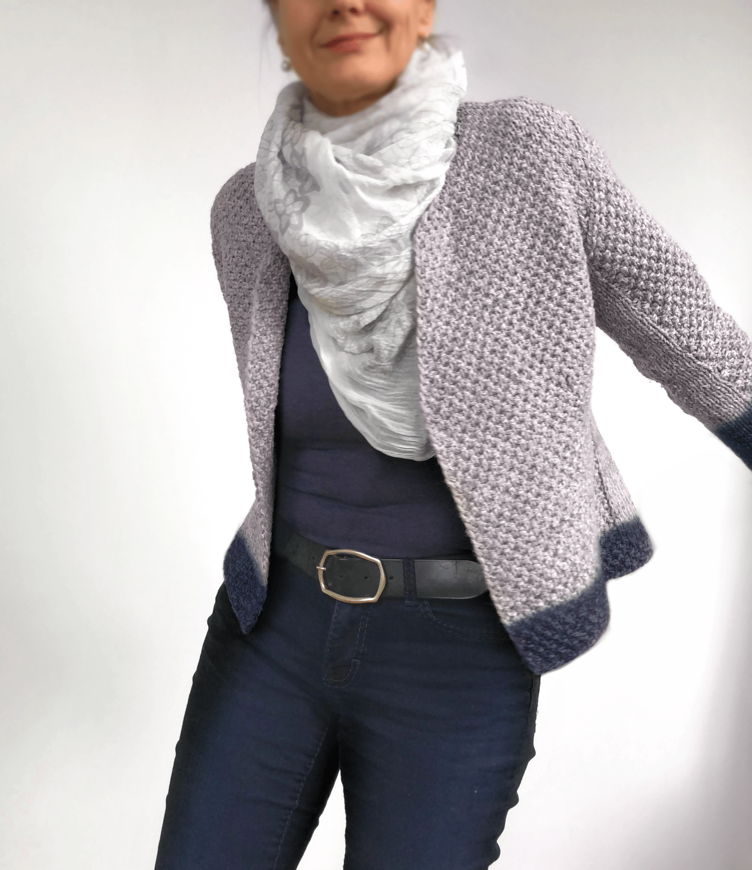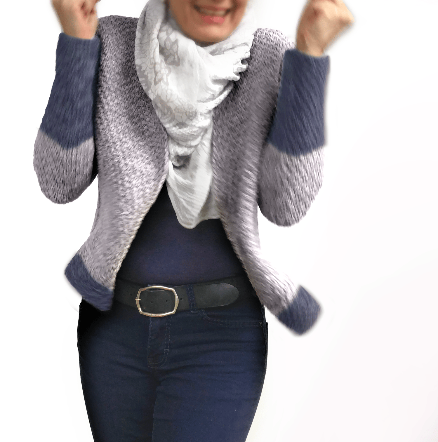 Lässig-klassische Jacke in coolem Grobstrick mit Farbakzenten. Bürotauglich zum Kleid oder lässig mit Jeans. Mit oder ohne Knöpfen.