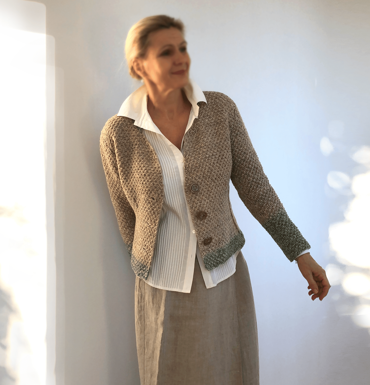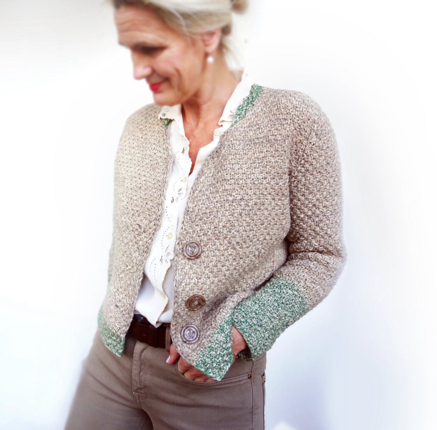 Timeless chic in a tweed-like jacket-cardigan with contrasting accents. Elegant and classy with a dress or cool and casual with jeans. With or without buttons.