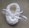 These 8ply garter stitch baby shoes have a lace edging and ribbon tie. These shoes would be gorgeous for a special occasion such as a christening, wedding or baby’s first Christmas.
