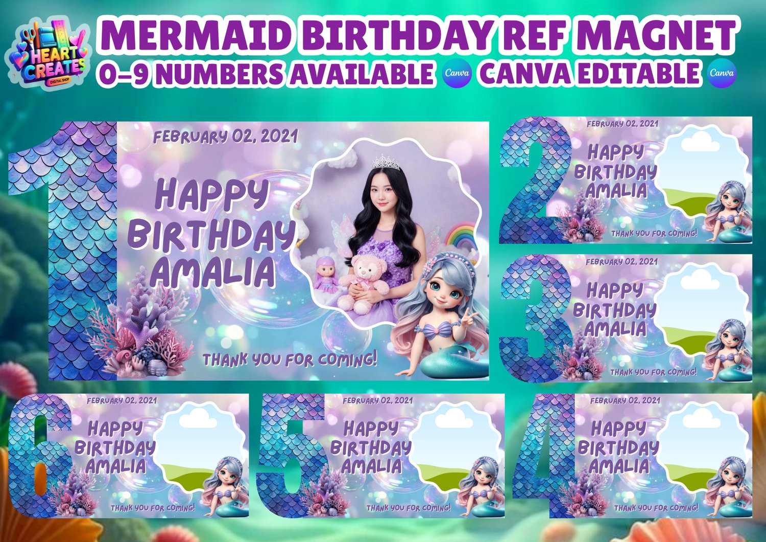 Celebrate your special day with our Mermaid Birthday Ref Magnet! This beautiful digital magnet features a cute mermaid design and is perfect for birthday parties. It is fully editable using Canva, so you can easily change the name, date, or message to personalize it. The magnet includes numbers from 0 to 9, so you can customize the age to match your birthday girl. Bright, fun, and easy to edit, this Mermaid Birthday Ref Magnet is a wonderful addition to any birthday celebration!