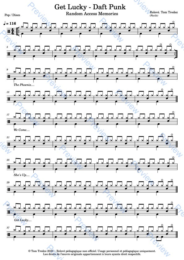 Partition complète de Get Lucky - Daft Punk, réarrangée pour la batterie à destination des débutants.