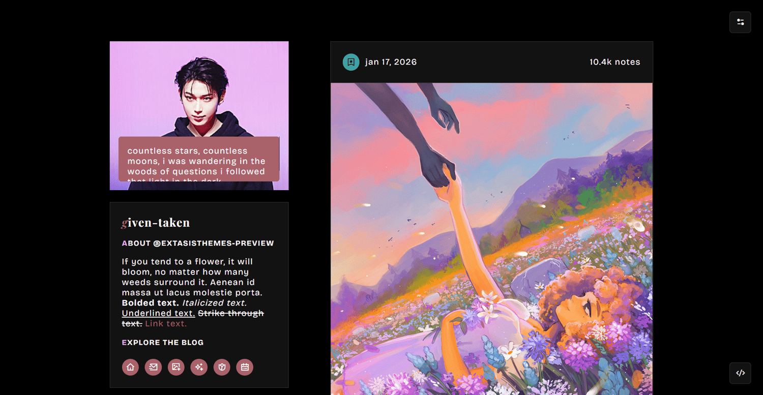 notes: please check your settings if you allow people to ask you questions or submit to you things. otherwise, your ask and submit links won’t show. npf posts friendly (+ among other things!). full credits to the resources, scripts and tutorials are found on the bottom right corner. if you found any coding bugs in my work, please send me a message. i will get back to your shortly.
