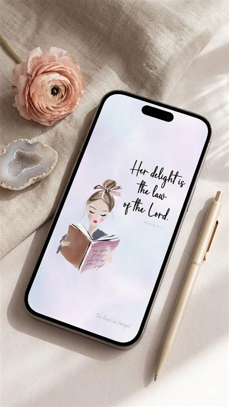 Scripture iPhone Wallpaper – Her Delight Is the Law of the Lord | Christian Phone Background | Feminine Faith Wallpaper | Bible Verse Aesthetic Psalm 1:2