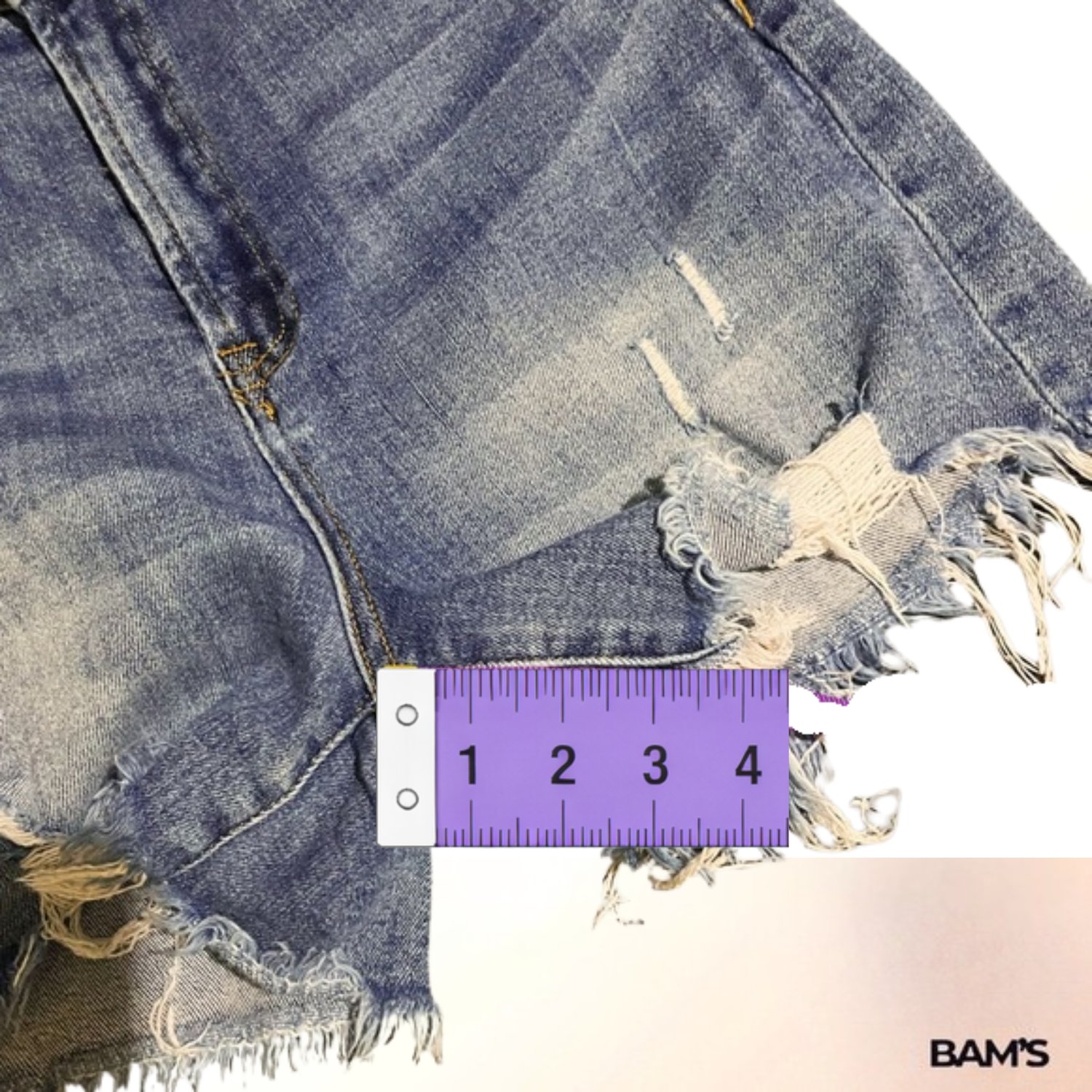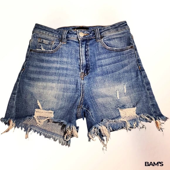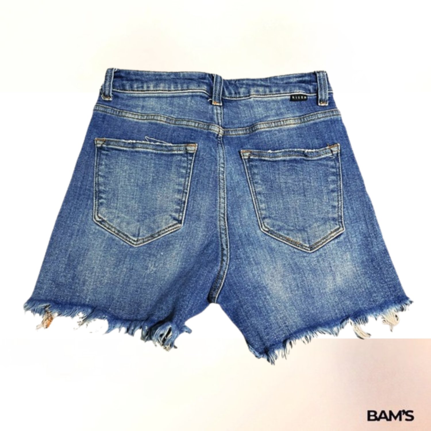Risen high-rise distressed denim shorts in a classic medium wash. Features a flattering high-waisted fit, subtle distressing, and raw frayed hem for a casual, lived-in look. Comfortable stretch denim that hugs in all the right places.