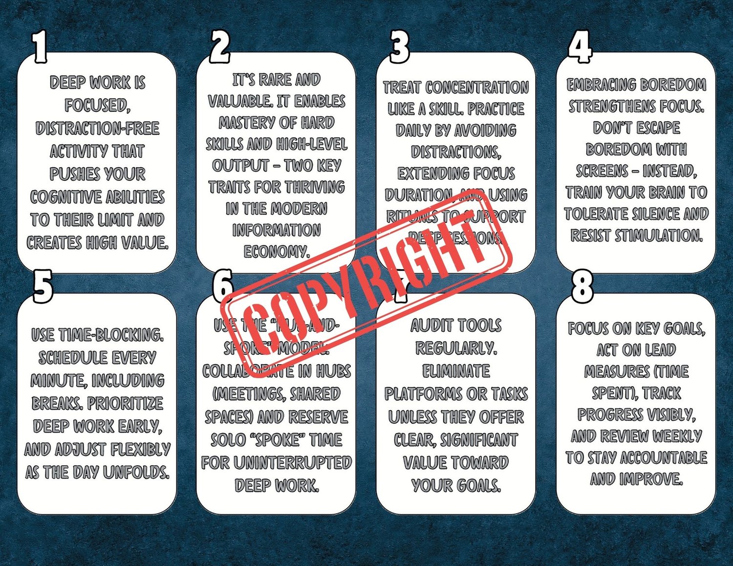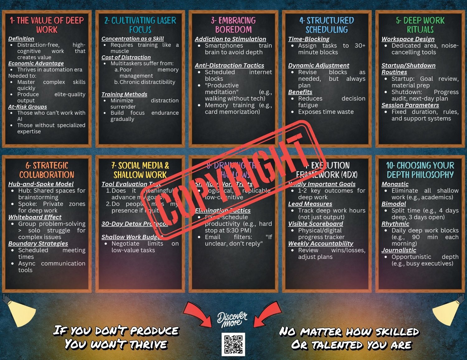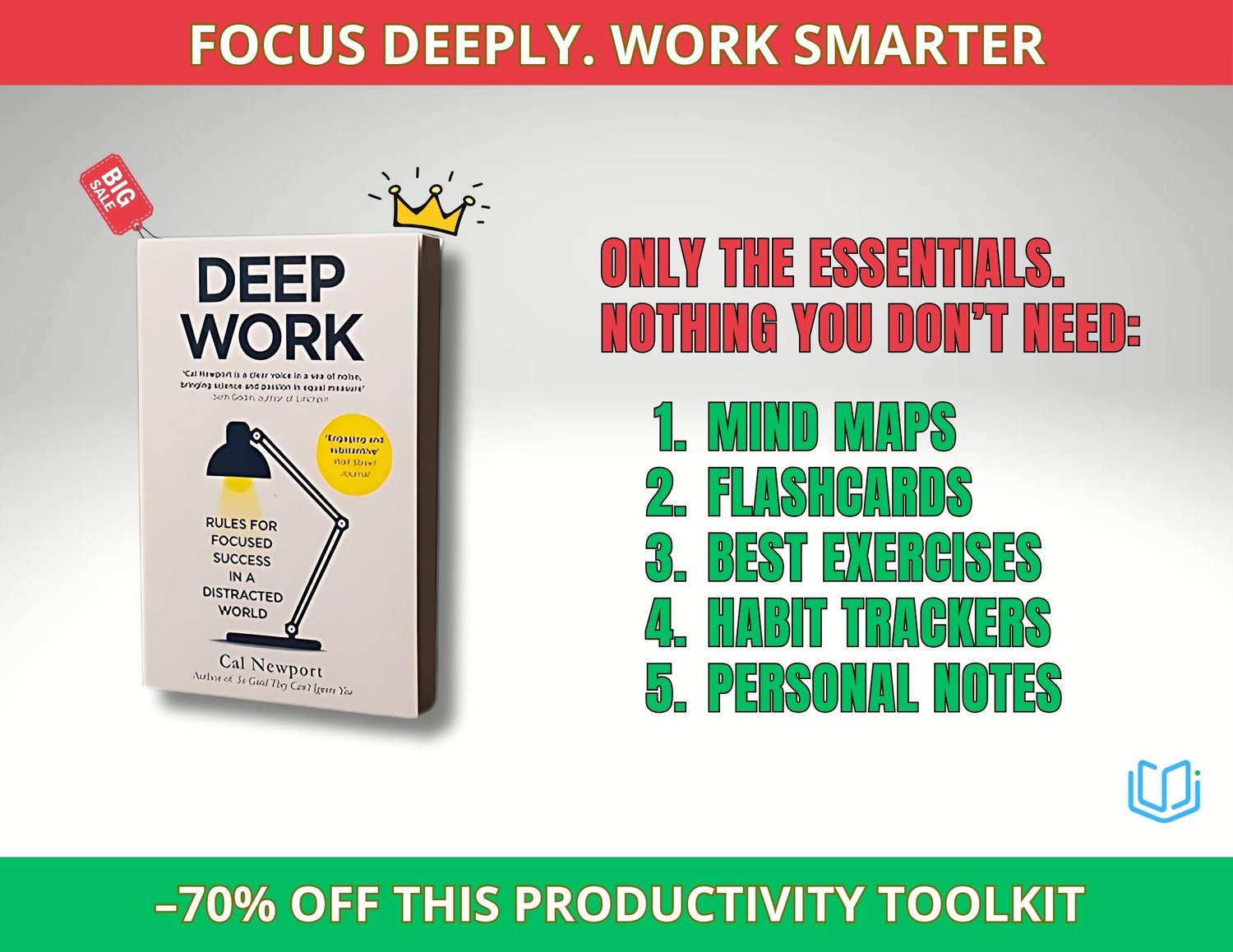 This isn’t just a book summary. It’s a practical system designed to help you apply Cal Newport’s strategies for deep focus, eliminate distractions, and produce high-impact work in less time.