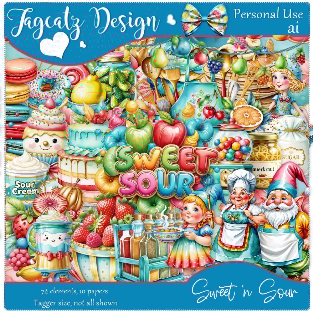 Tickle your taste buds with things sweet and sour! Cute kit with some adorable gnome chefs too. 74 tasty elements and 10 matching papers. AI generated. Tagger size. Not all shown. Personal use only.