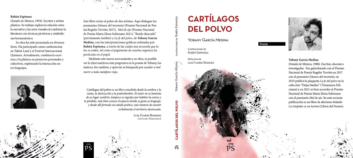 Este libro reúne el polvo de dos artistas. Aquí dialogan los poemarios Sótanos del insomnio (Premio Nacional de Poesía Rogelio Treviño 2017), Mal de ojo (Premio Nacional de Poesía María Elena Solórzano 2021), Ruido disecado (previamente inédito) y La fe del polvo, de Yobany García Medina, con las interpretaciones gráficas realizadas por Rubén Espinoza, a través de las cuales nos recuerda que la luz es orden, tal como el pegamento de caseína organiza las partículas en el papel.