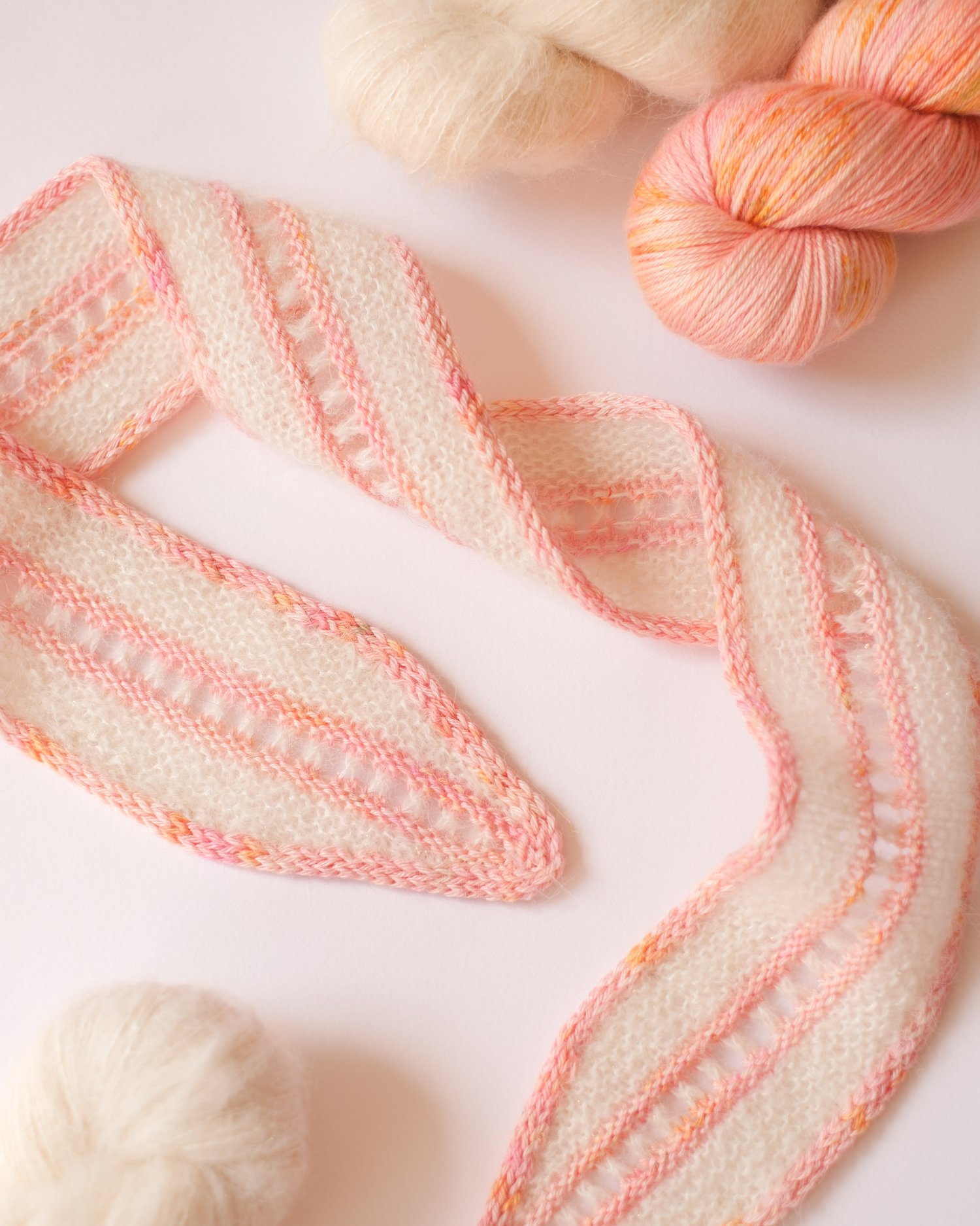 - Sample scarves: MC - Rainbow Suri Fluff from Peninsula Yarn (64% baby Suri alpaca, 26% silk, 10% stellina; 1.75oz / 50g, 328yds / 300m) in color Naked; CC - Merino Silk Fingering from Peninsula Yarn (60% non-superwash merino, 40% silk; 3.5oz / 100g, 465yds / 425m) in color Peony