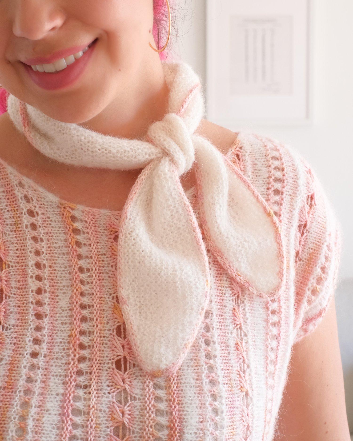 Three sizes, adjustable width and length, and an option to knit a plain center make it easy to create a piece that suits your taste. Depending on the chosen size, the scarf can be tied as a kerchief, wrapped around the neck twice for extra warmth, worn as a headband, a tie, or a bow on a handbag ⚘
