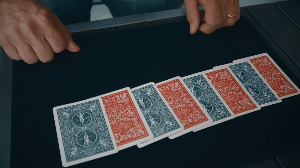 Here’s what happens. The magician introduces the concept of oil and water and how they separate. Eight cards are introduced. 4 blue-backed black cards and 4 red-backed red cards. The cards are interlaced and separate when they are face up. The cards are interlaced again and sort while face down. The final kicker is that with a shake the colors re-mix right in front of the spectator’s eyes.