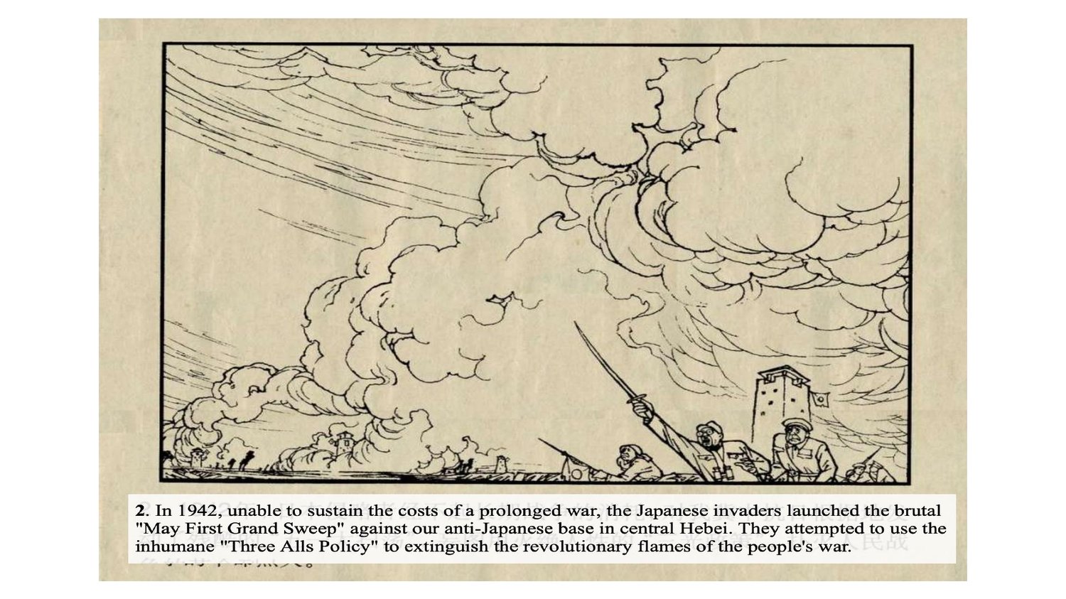2. In 1942, unable to sustain the costs of a prolonged war, the Japanese invaders launched the brutal "May First Grand Sweep" against our anti-Japanese base in central Hebei. They attempted to use the inhumane "Three Alls Policy" to extinguish the revolutionary flames of the people's war.