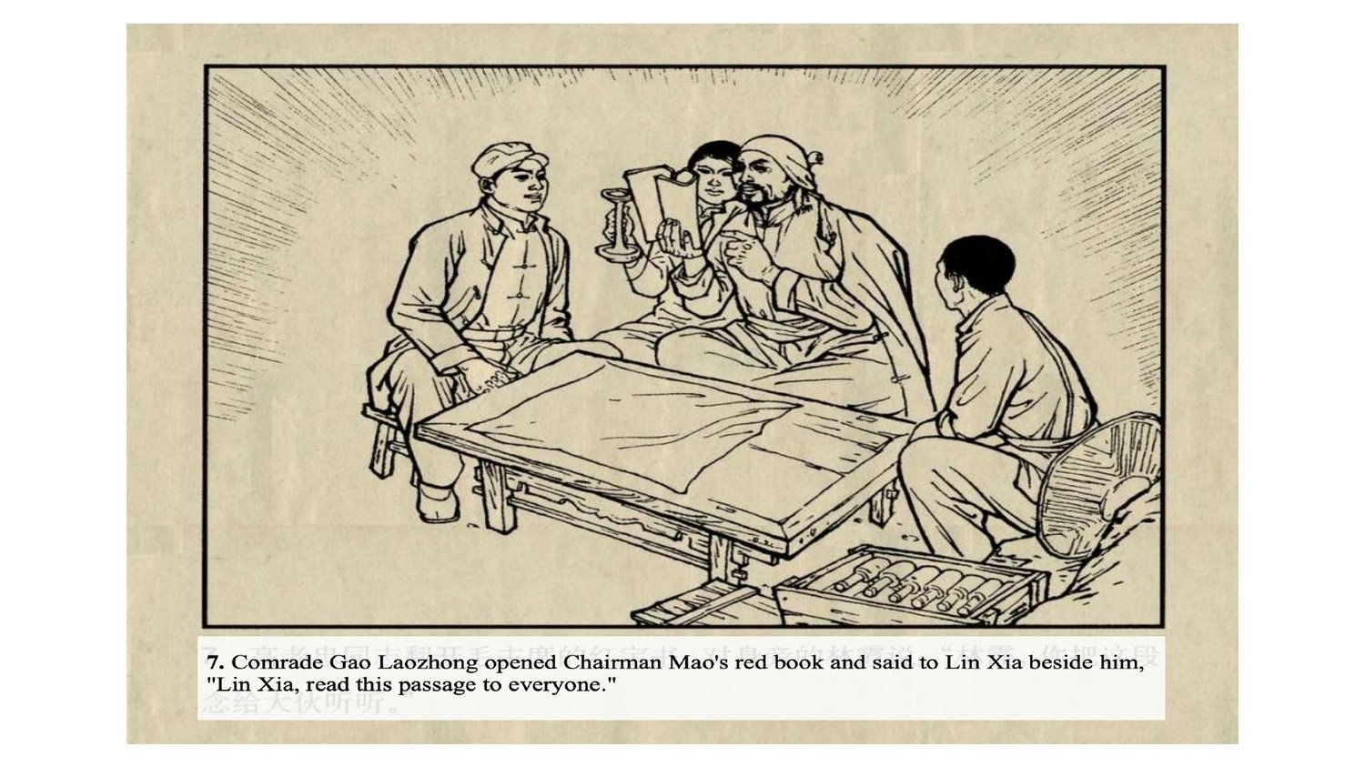 7. Comrade Gao Laozhong opened Chairman Mao's red book and said to Lin Xia beside him, "Lin Xia, read this passage to everyone."