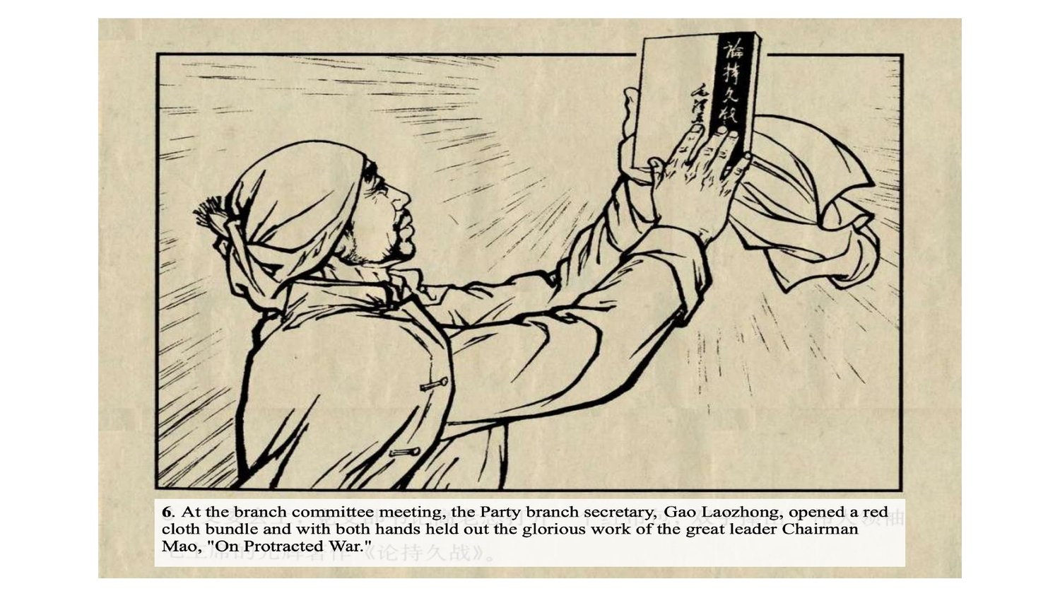 6. At the branch committee meeting, the Party branch secretary, Gao Laozhong, opened a red cloth bundle and with both hands held out the glorious work of the great leader Chairman Mao, "On Protracted War."