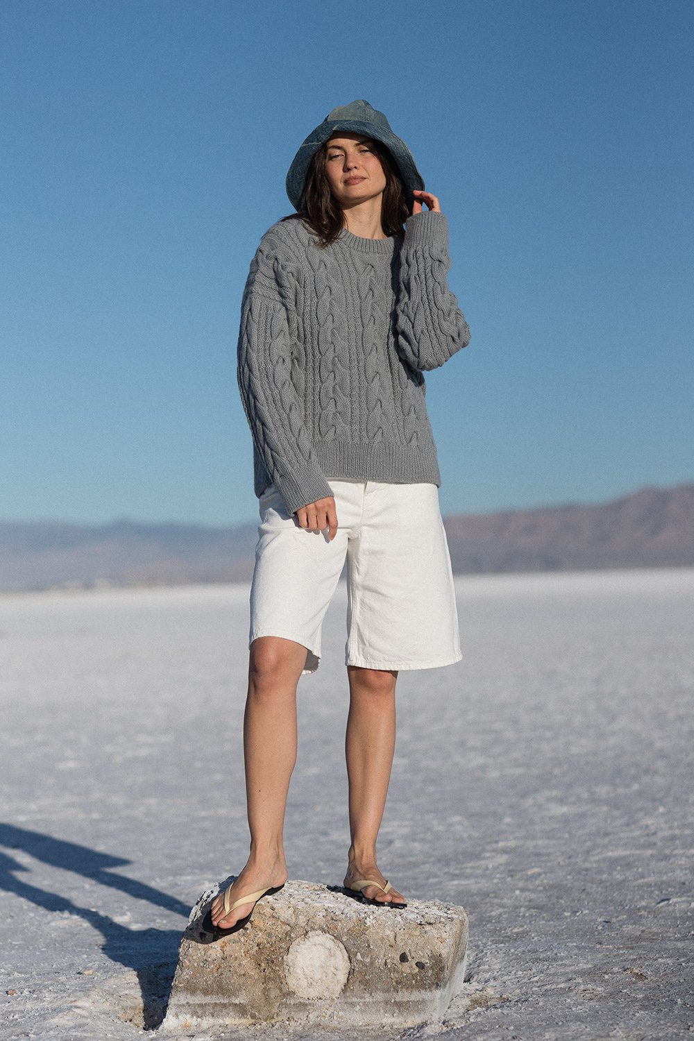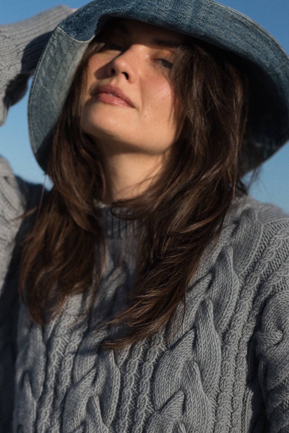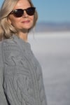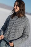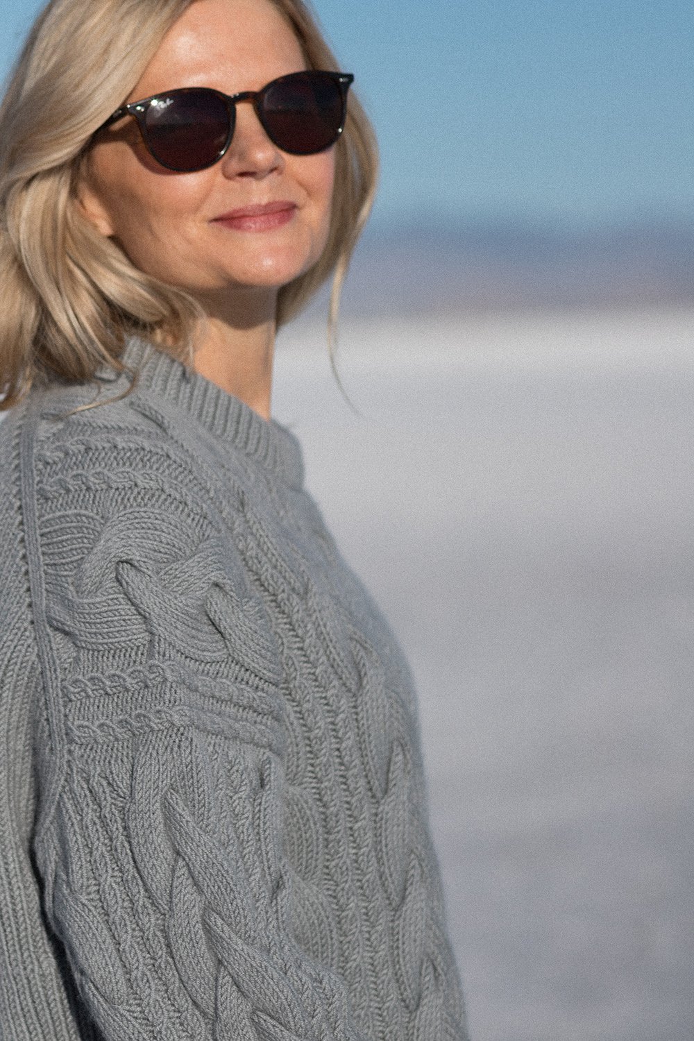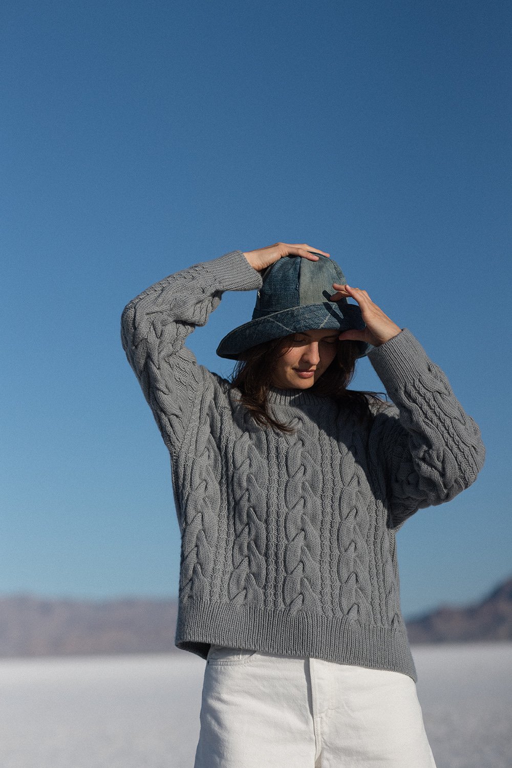 The Pierpont Sweater blends bold texture with quiet elegance. Worked from the top down, the front features a rich interplay of narrow twisted cables and larger, unexpected twists, creating striking depth and movement. The back is knit entirely in ribbing, transitioning seamlessly into a beautifully shaped neckline. Dropped shoulders, gentle slopes, and refined finishing touches give Pierpont the feel of a garment that drapes itself naturally. Knit in Woolfolk Tov, every detail shines with crisp, luxurious stitch definition.