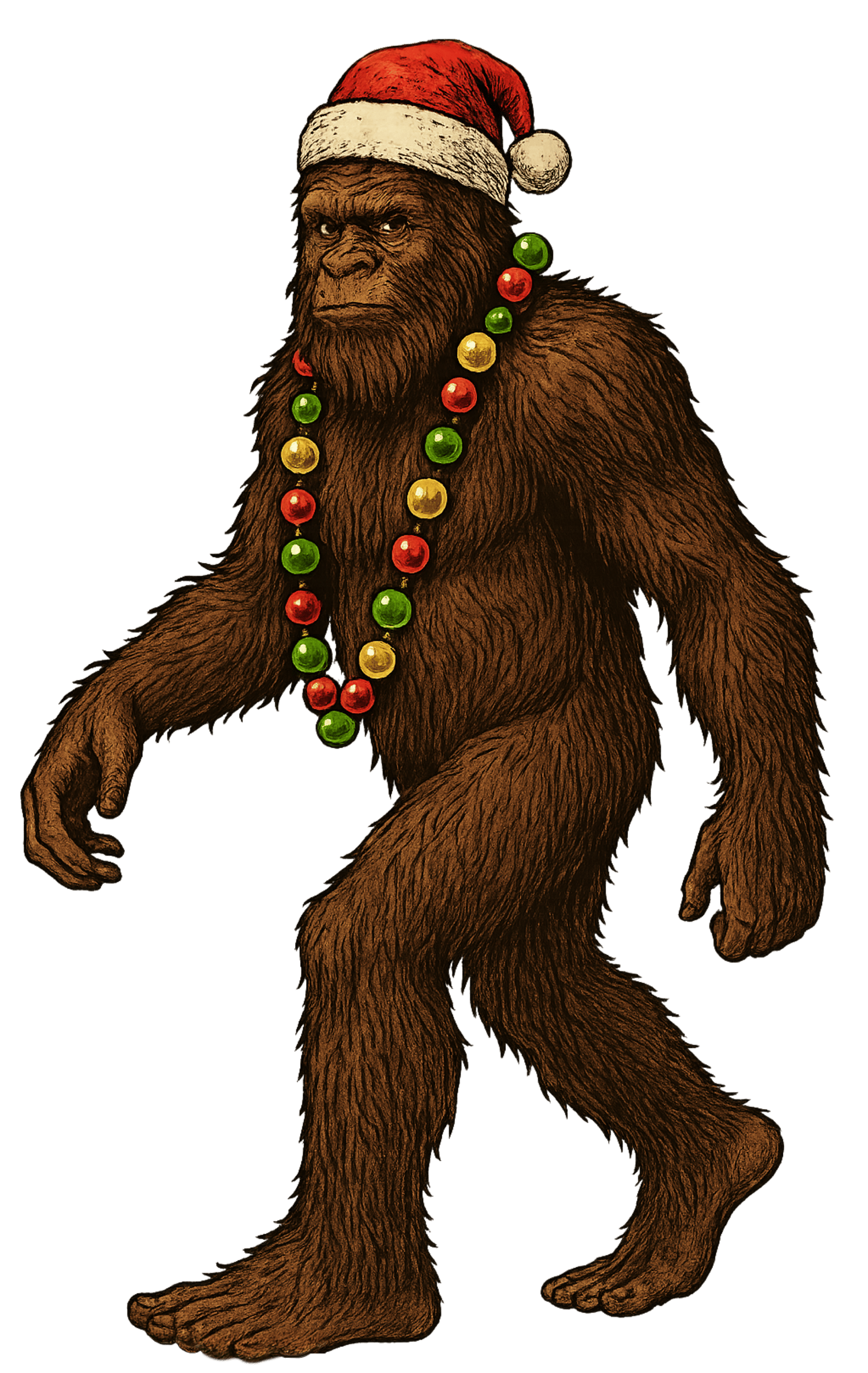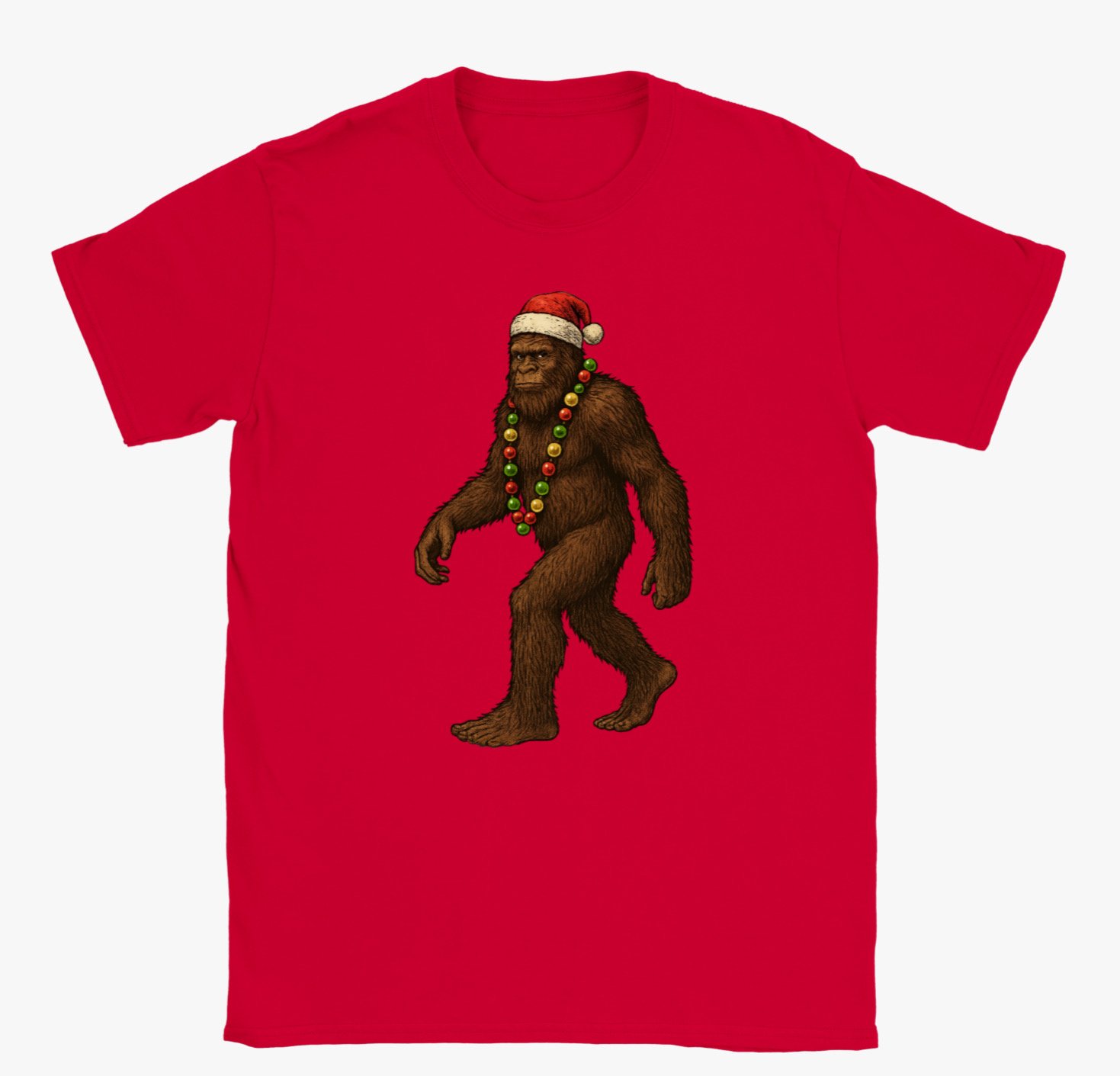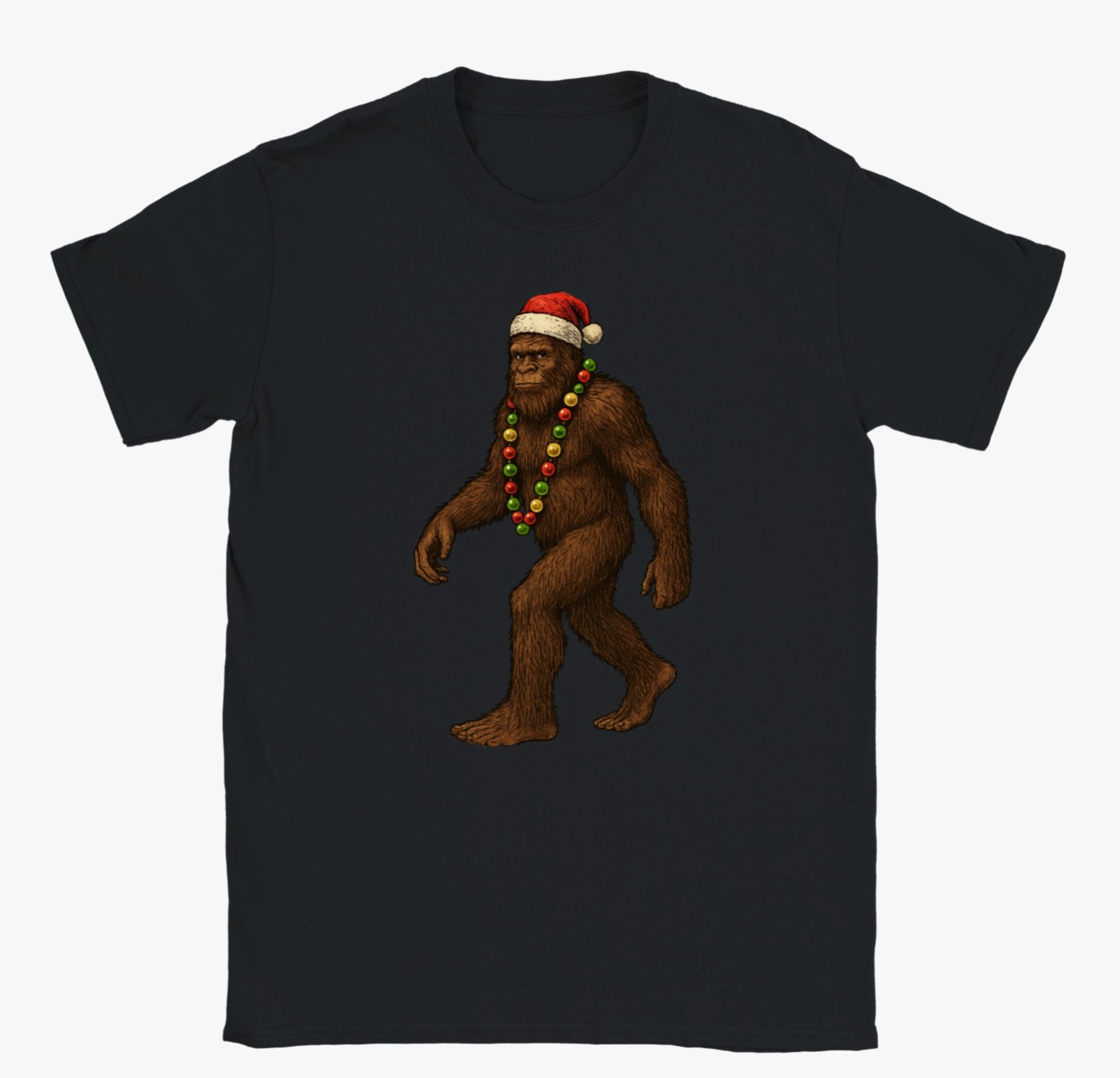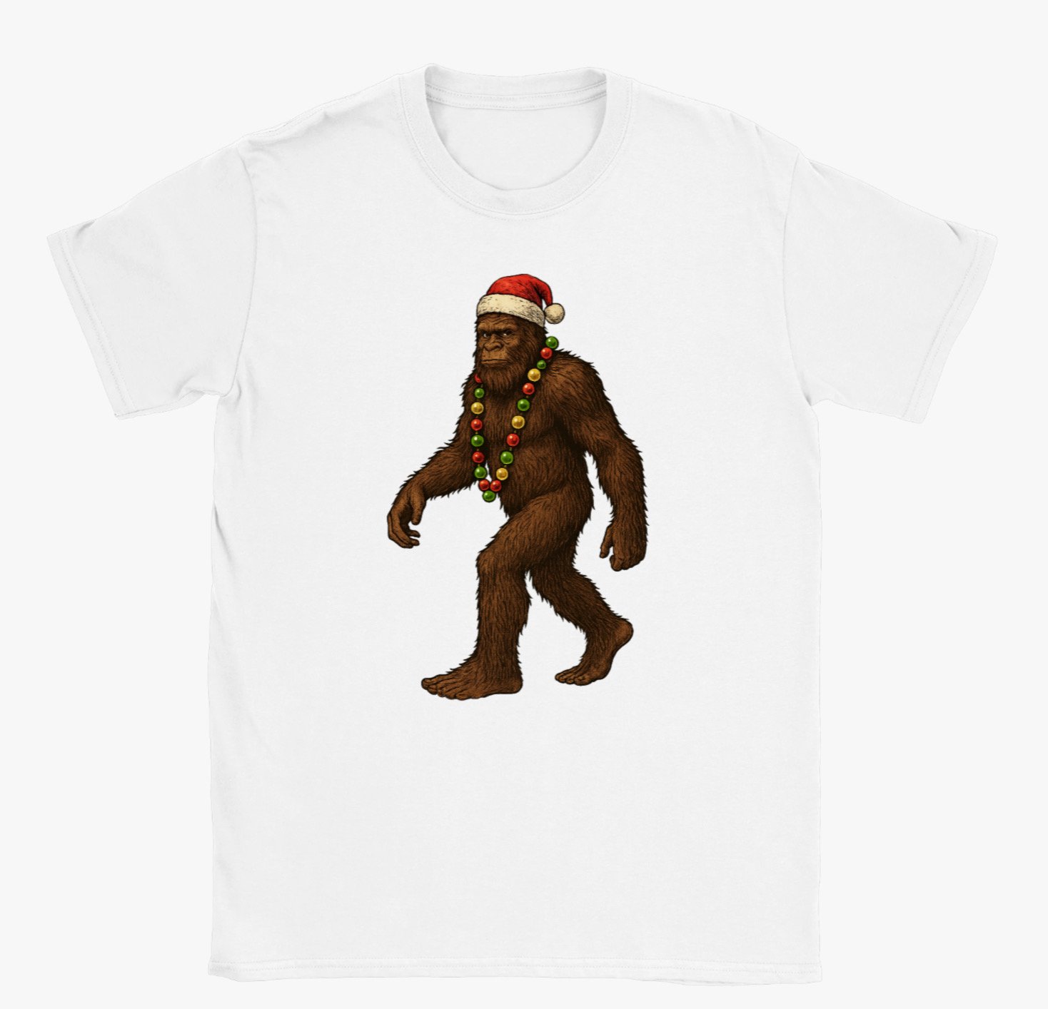 Get into the holiday spirit with a twist of mystery! This Christmas tee features a festive Bigfoot decked out in a Santa hat and a colorful string of Christmas ornaments. Perfect for anyone who loves cryptid lore, holiday humor, or just wants to stand out at the next ugly sweater party (without the sweater).