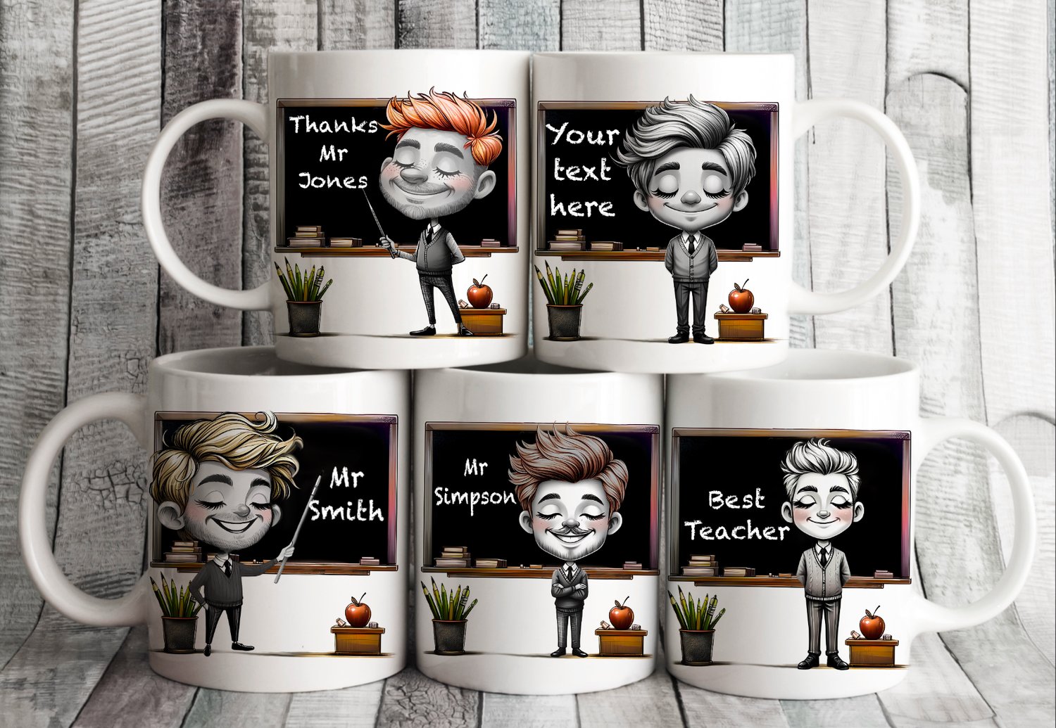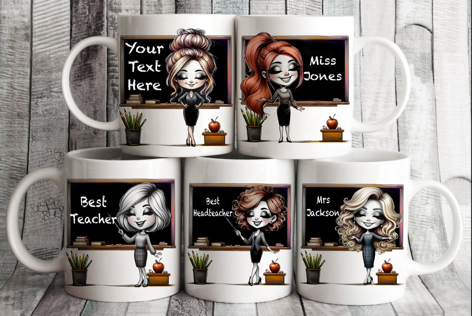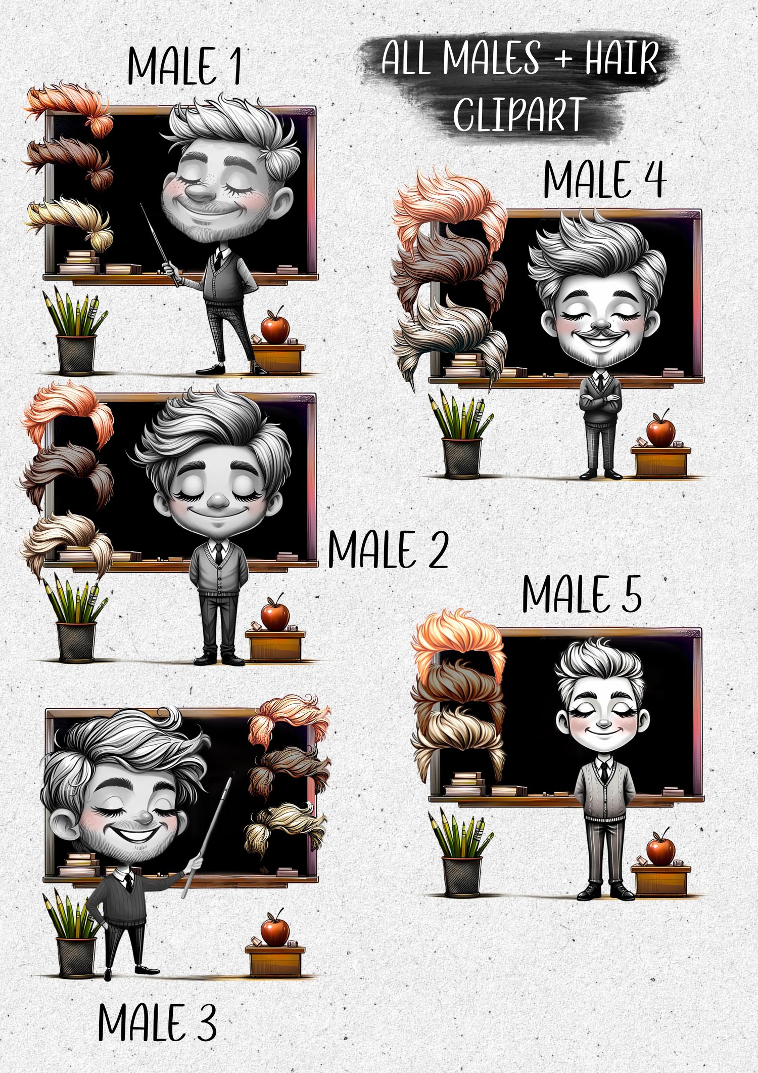 Whimsical teachers, 40 PNGs. 5 males and 5 females, all with grey hair as standard, simply add the hair clipart if you require colour; 3 colours supplied for each teacher. Designed on an 8" x 8" canvas, suitable for mugs, clothing, keyrings etc.