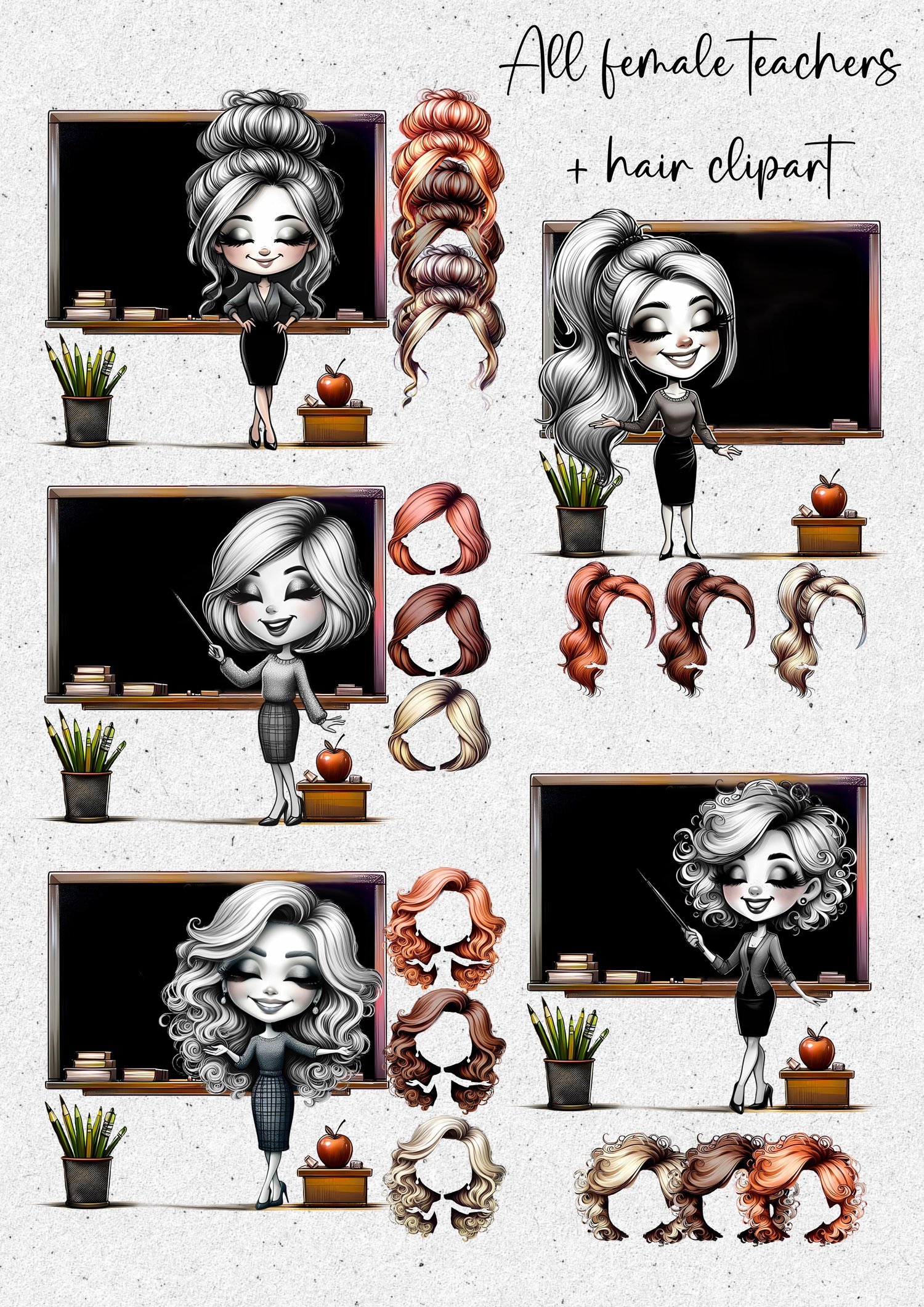 Whimsical teachers, 40 PNGs. 5 males and 5 females, all with grey hair as standard, simply add the hair clipart if you require colour