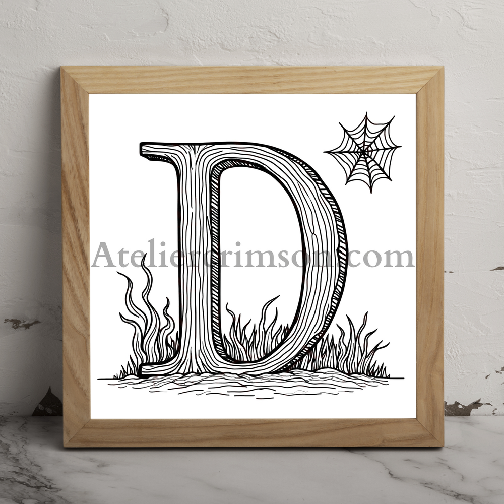 The letter D colloring book jack halloween Tim Burton-inspired alphabet art. Spooky-cute character in coloring book style. Perfect for Halloween crafts or gothic decor.