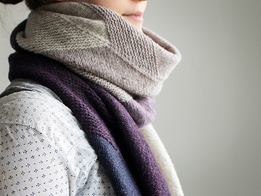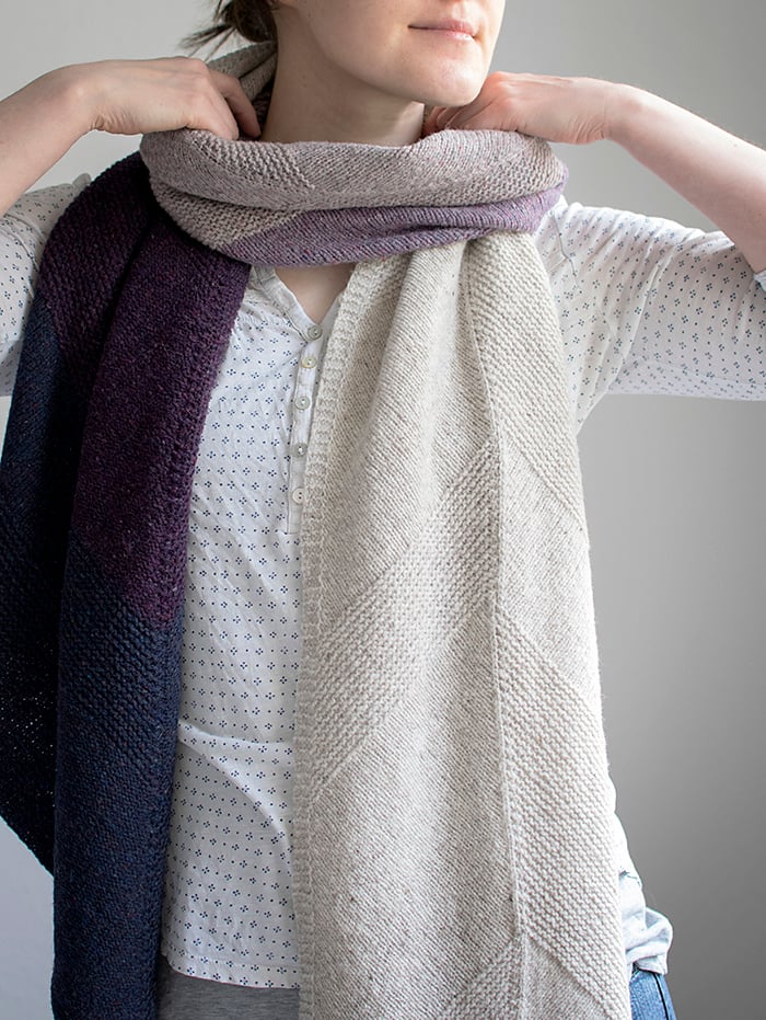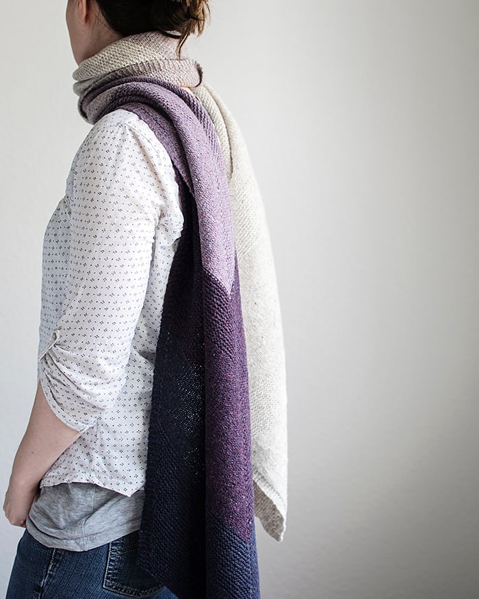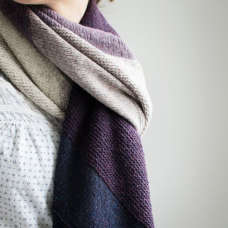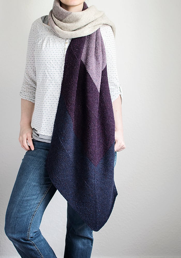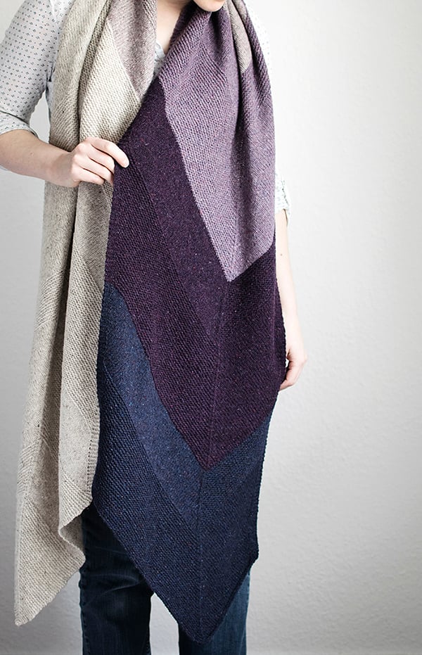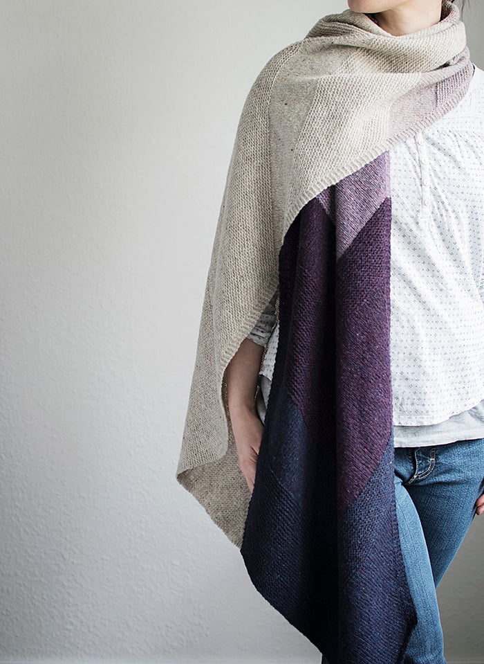 “Farbulus” is an asymmetrically shaped shawl, knitted sideways from one short end to the other. A simple and very relaxing project, yet the alternating sections between plain stockinette and garter stitch, plus changing color blocks will keep you interested.