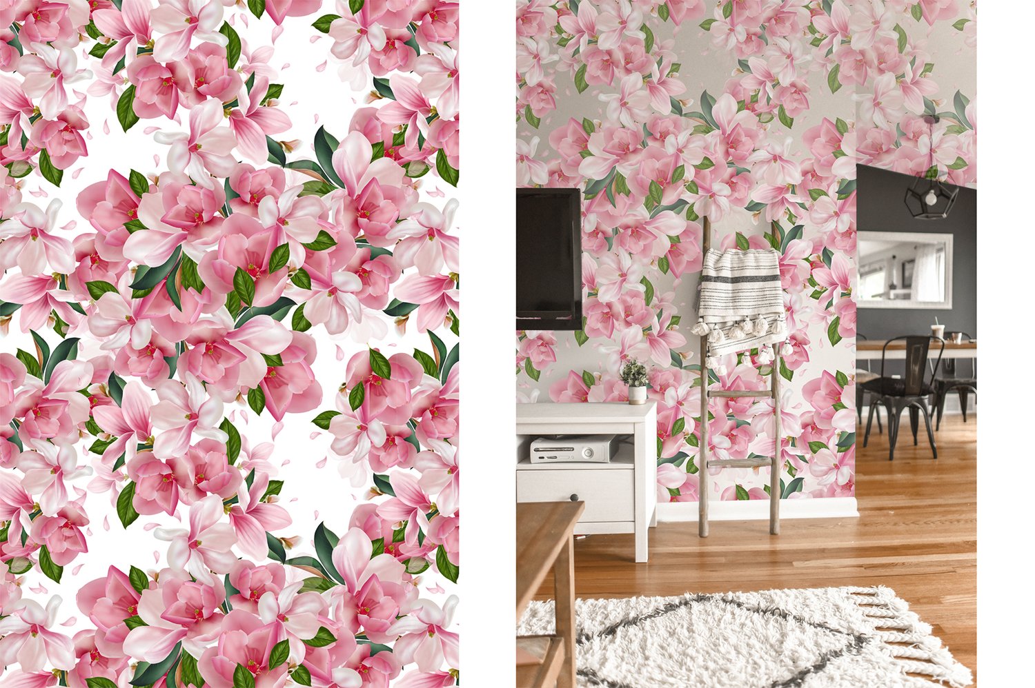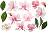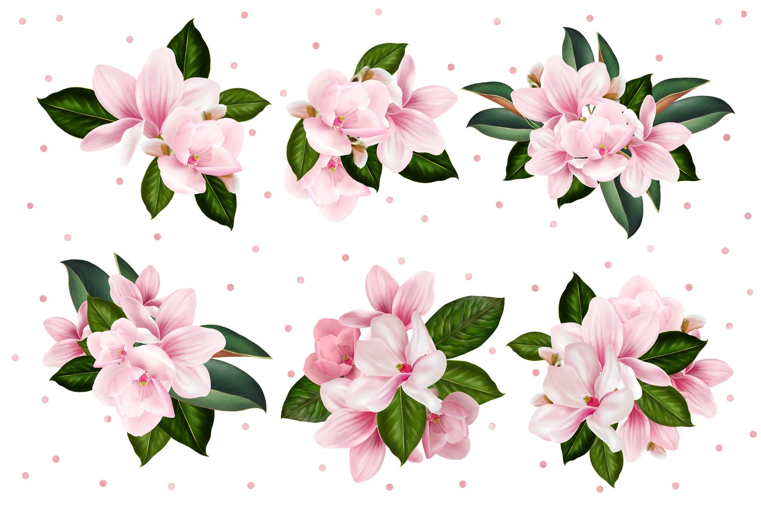 A wonderful collection of beautiful pink spring magnolia flowers for your design. Magnolia flowers, leaves, buds. Use a set for cards, design, patterns, wedding invitations and other which wish your imagination. The product also includes ready-made wreaths, bouquets and patterns. You will get:
