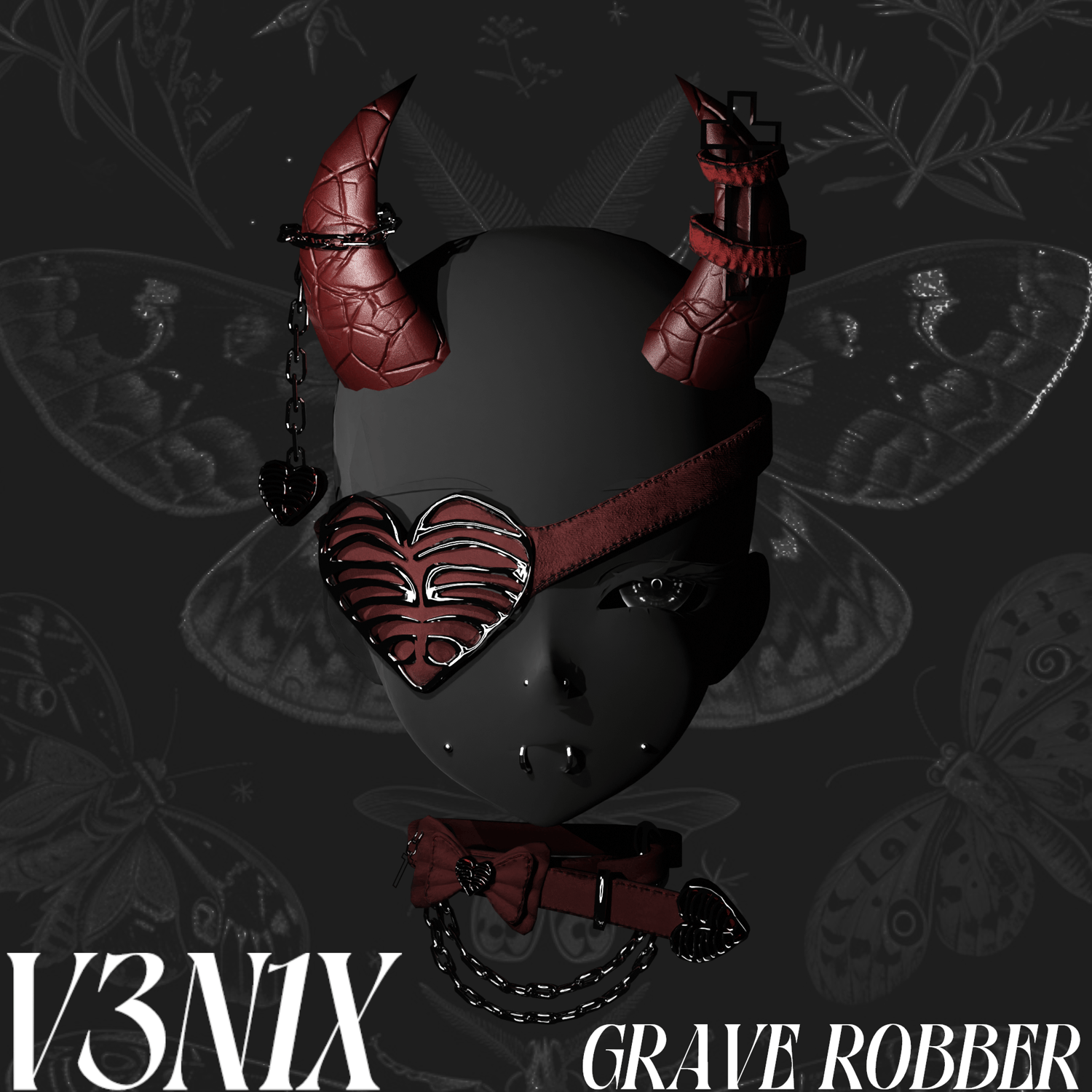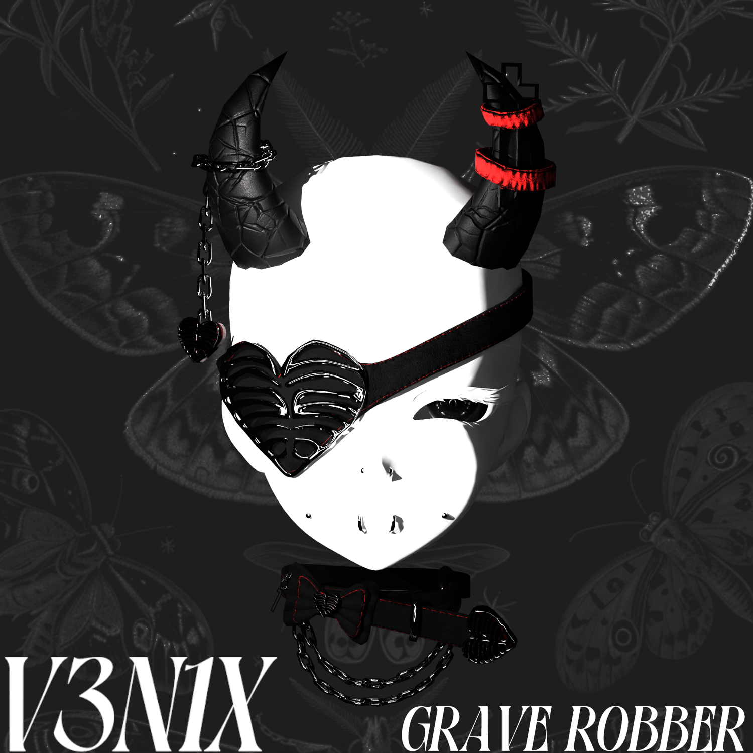 Grave Robber comes with: horns eyepatch, piercings, and belt choker