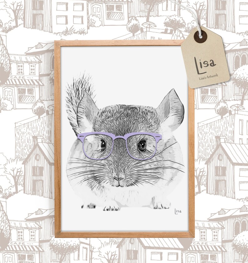 Violet chinchilla printable wall art, Animal art print, animal with glasses, Funny animal prints, black and white print, cute chinchilla