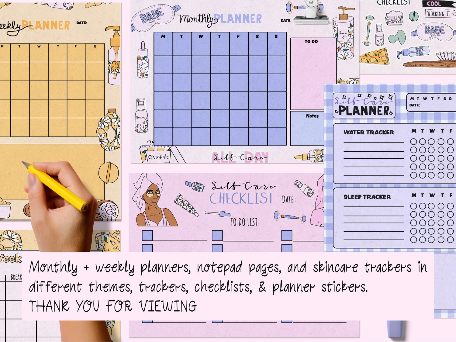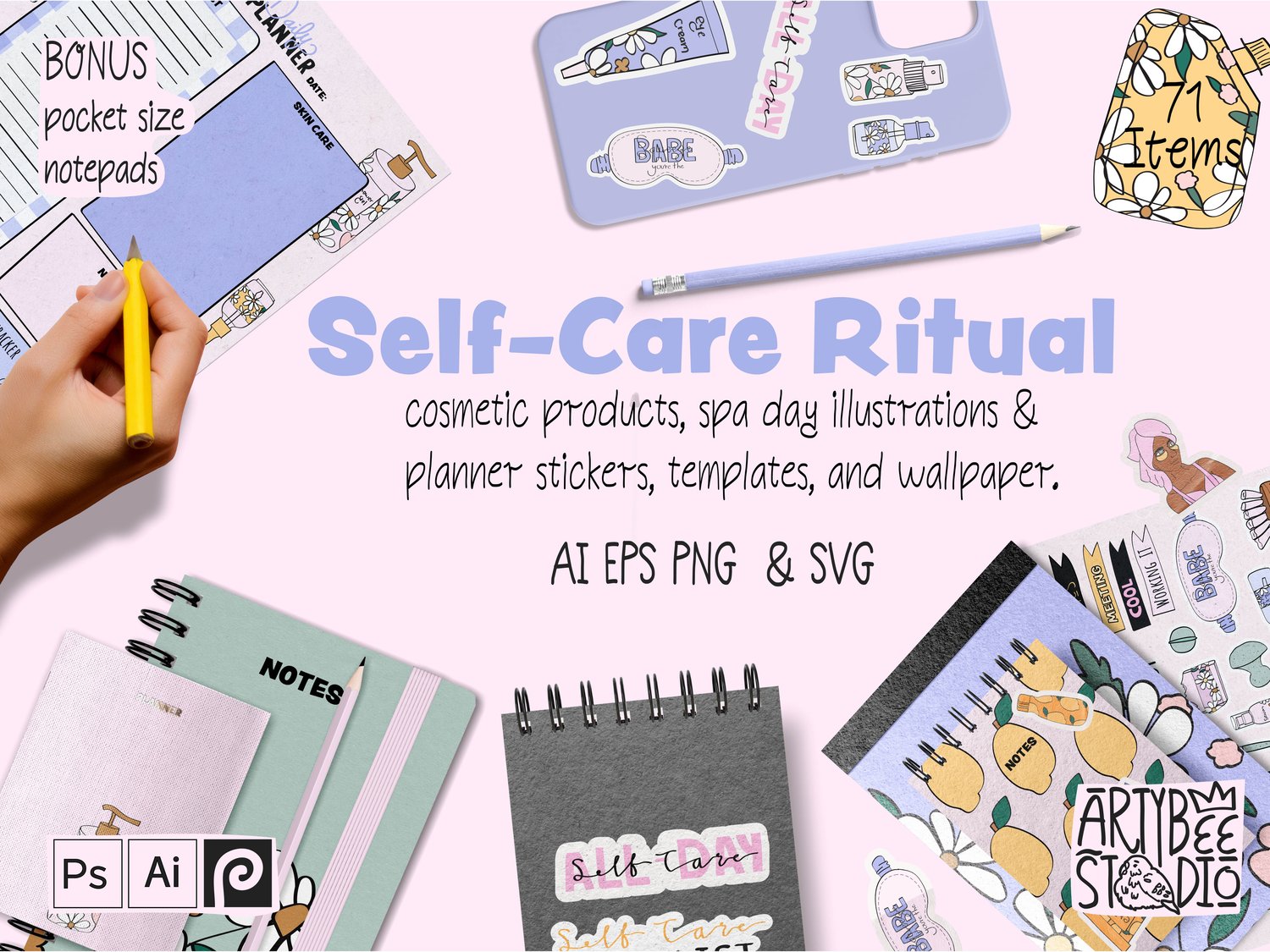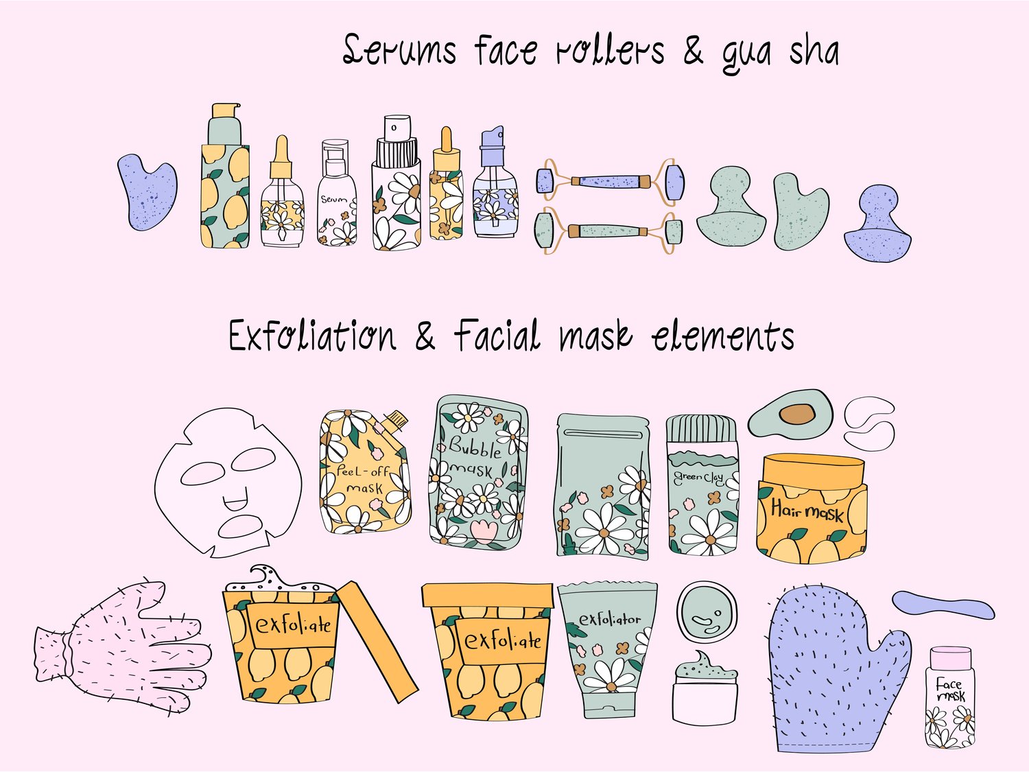 This self-care and skincare product pack, which includes 71 illustrations, 16 templates, and 1 background, will help you be more organized and look super cute and fresh.