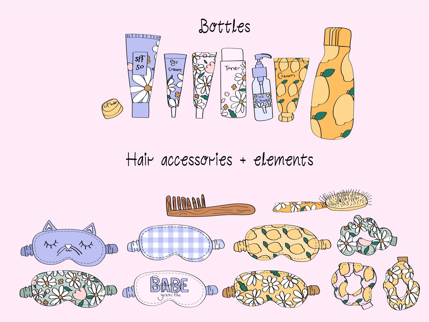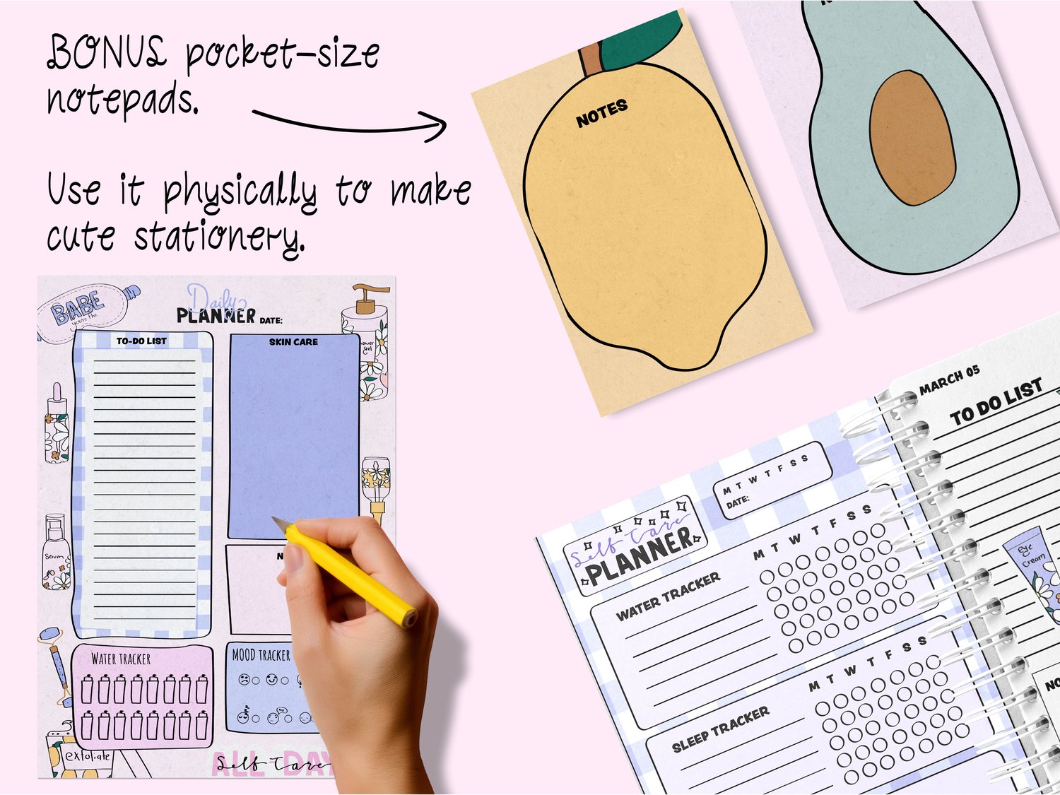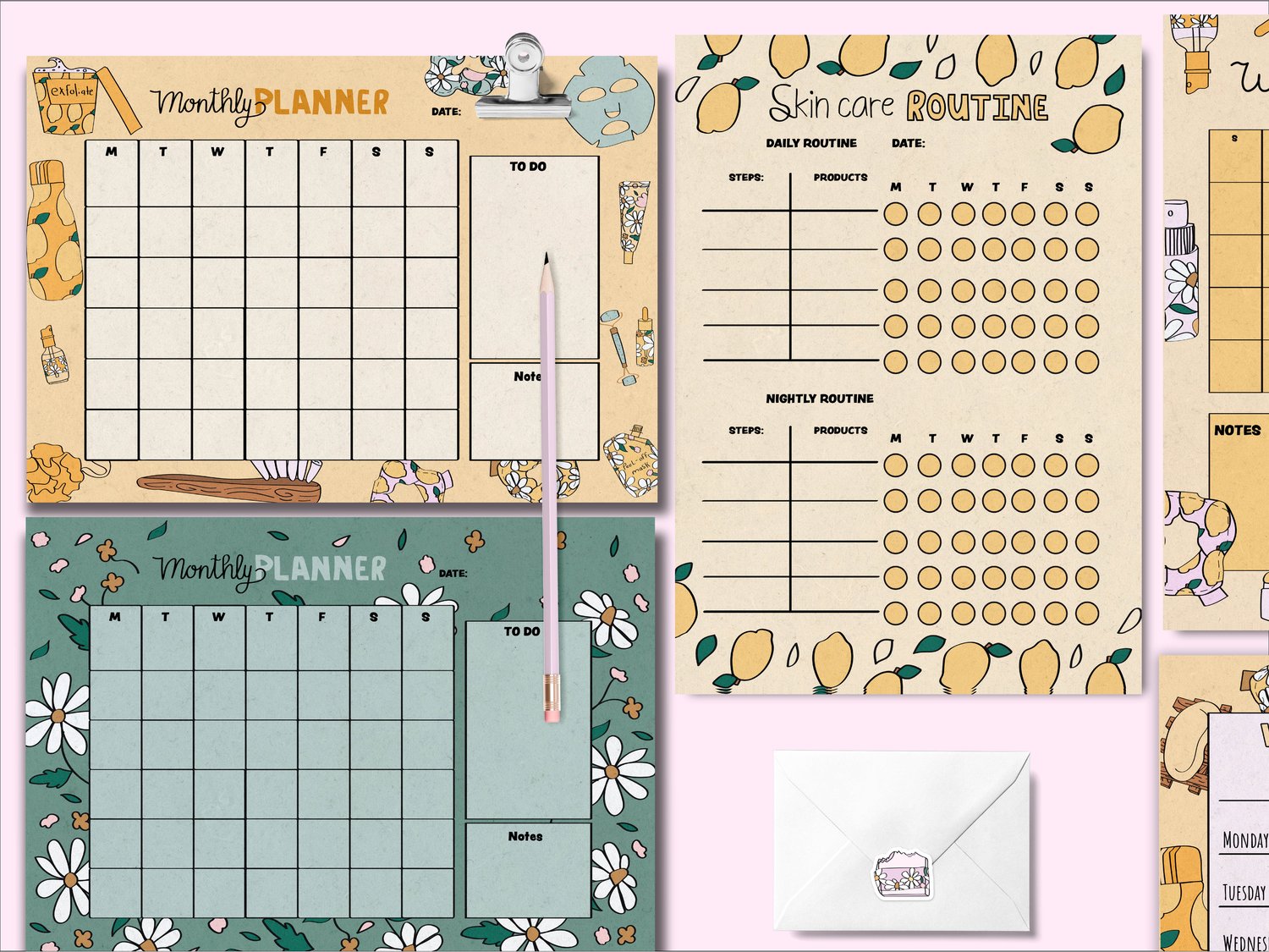 This self-care and skincare product pack, which includes 71 illustrations, 16 templates, and 1 background, will help you be more organized and look super cute and fresh.