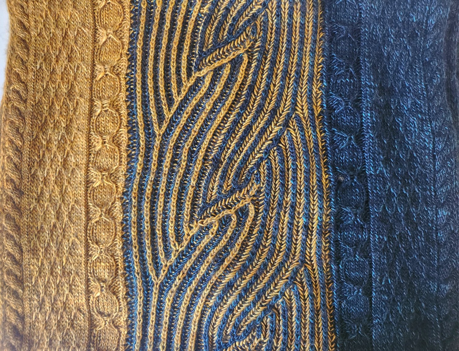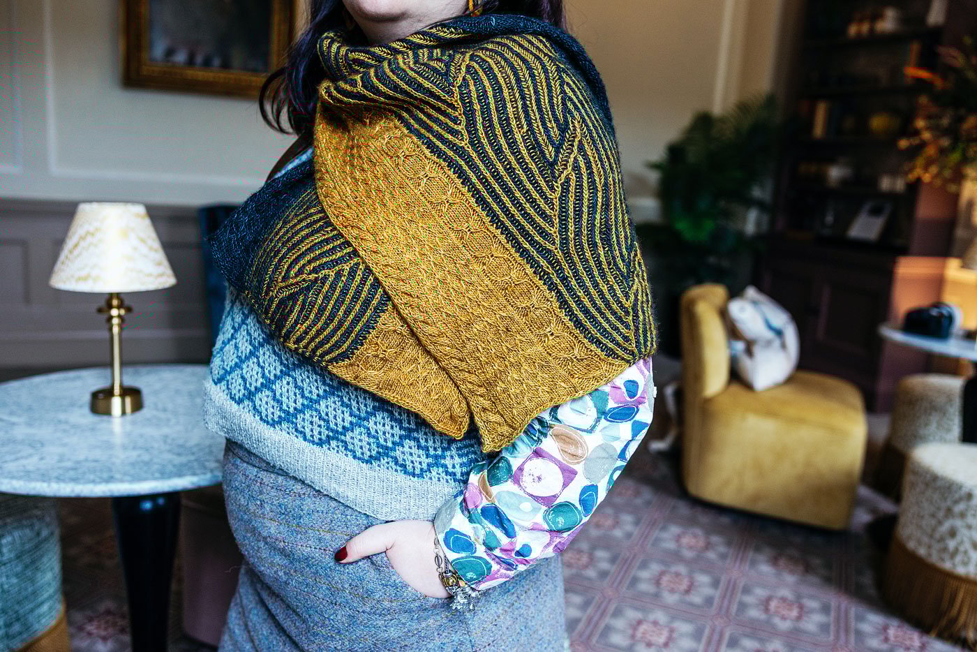Each edge of the wrap is worked in one colour only, with a mirrored set of motifs representing rope cables, mermaid scales and the mermaid's mirror. The colours come together in the central syncopated brioche section of interlocking waves. This section is worked in a single pass rather than the traditional "colour A, slide, colour B, turn" sequence of brioche knitting - but the pattern includes a tutorial video for how I worked this in a single pass.