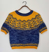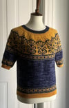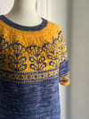 The Flowericious Pullover is a stunning top-down Fair Isle design in vibrant yellow and blue, blending timeless colorwork with effortless elegance—perfect for knitters who crave a joyful and captivating project
