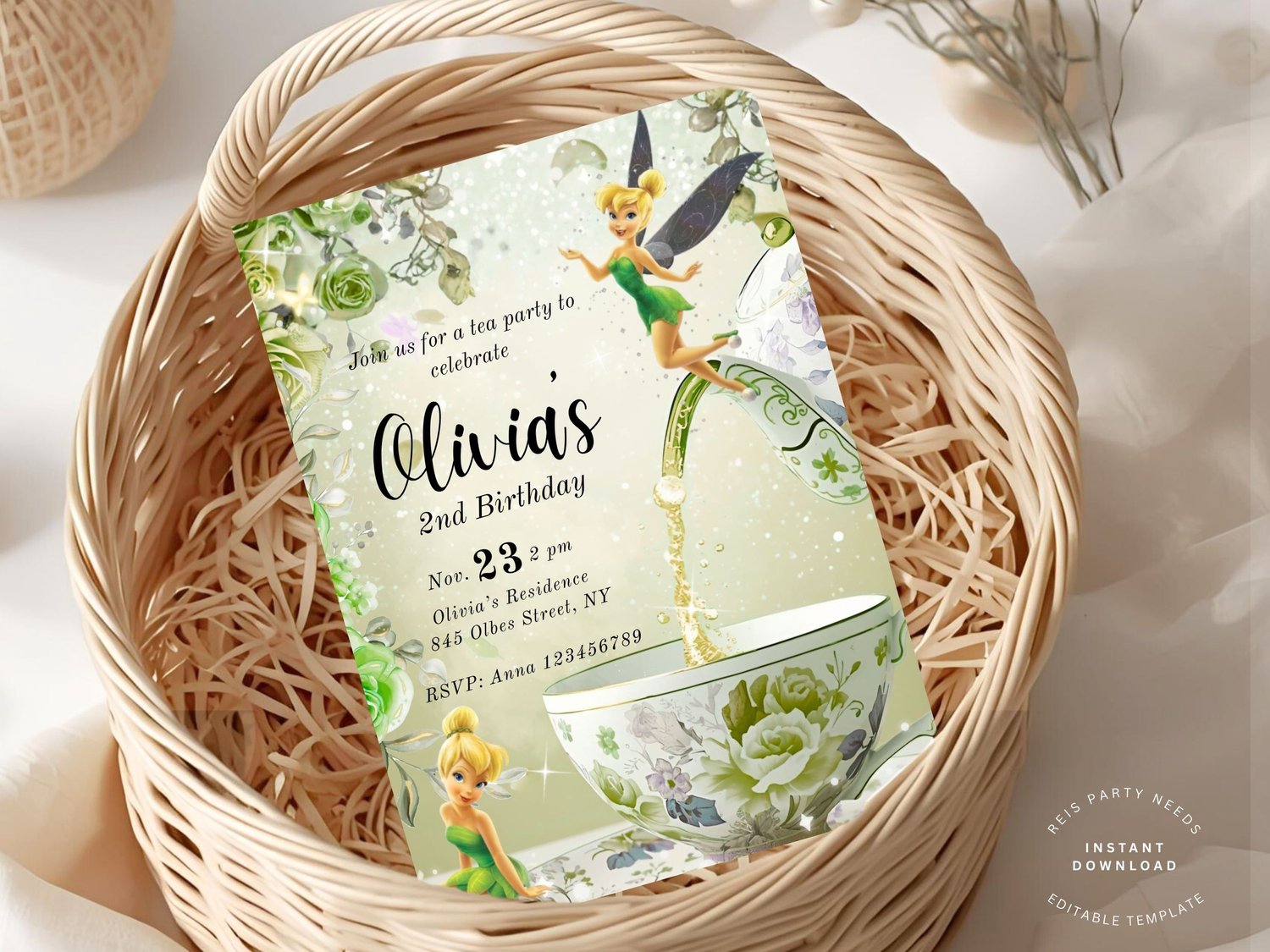 Tinker Bell Tea Party Birthday Invitation Template | Fairy 2nd Birthday Invite | Editable Green Floral Printable Party Invitation