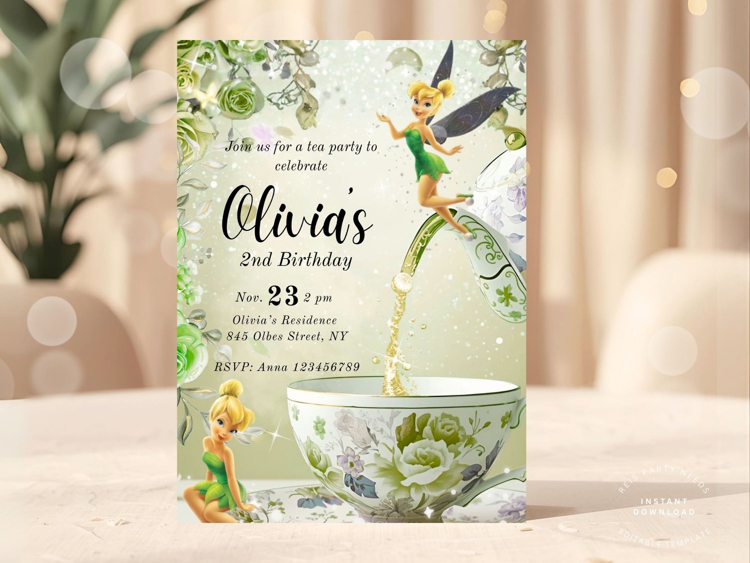 Make your little one’s birthday sparkle with this enchanting Tinker Bell Tea Party Invitation Template. Featuring a whimsical fairy design, elegant green florals, and a vintage teacup aesthetic, this invite is perfect for a 2nd birthday fairy celebration.