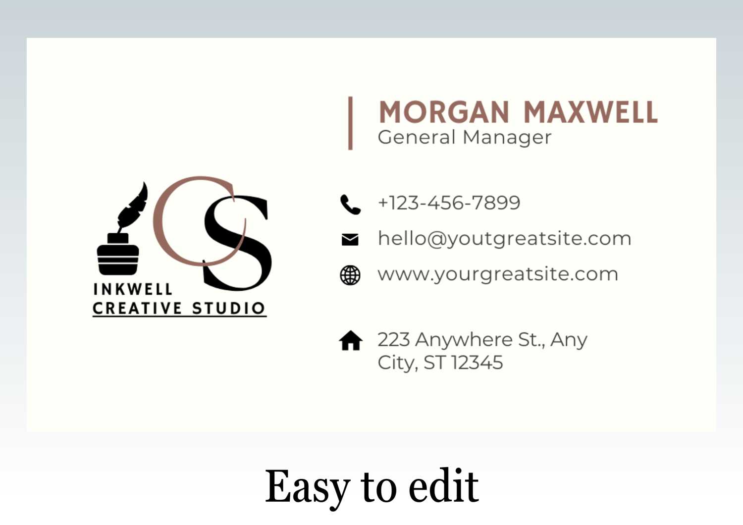 Our Graphic Inkwell Business Card is a simple, elegant design that combines the logos of a graphic inkwell and fountain pen with the name of your business in a sophisticated font. , ensuring durability and a luxurious feel. The front of the card showcases the sleek graphic inkwell and fountain pen logo, elegantly designed to make a statement and capture attention. The logo's intricate details and clean lines embody a sense of craftsmanship and excellence.