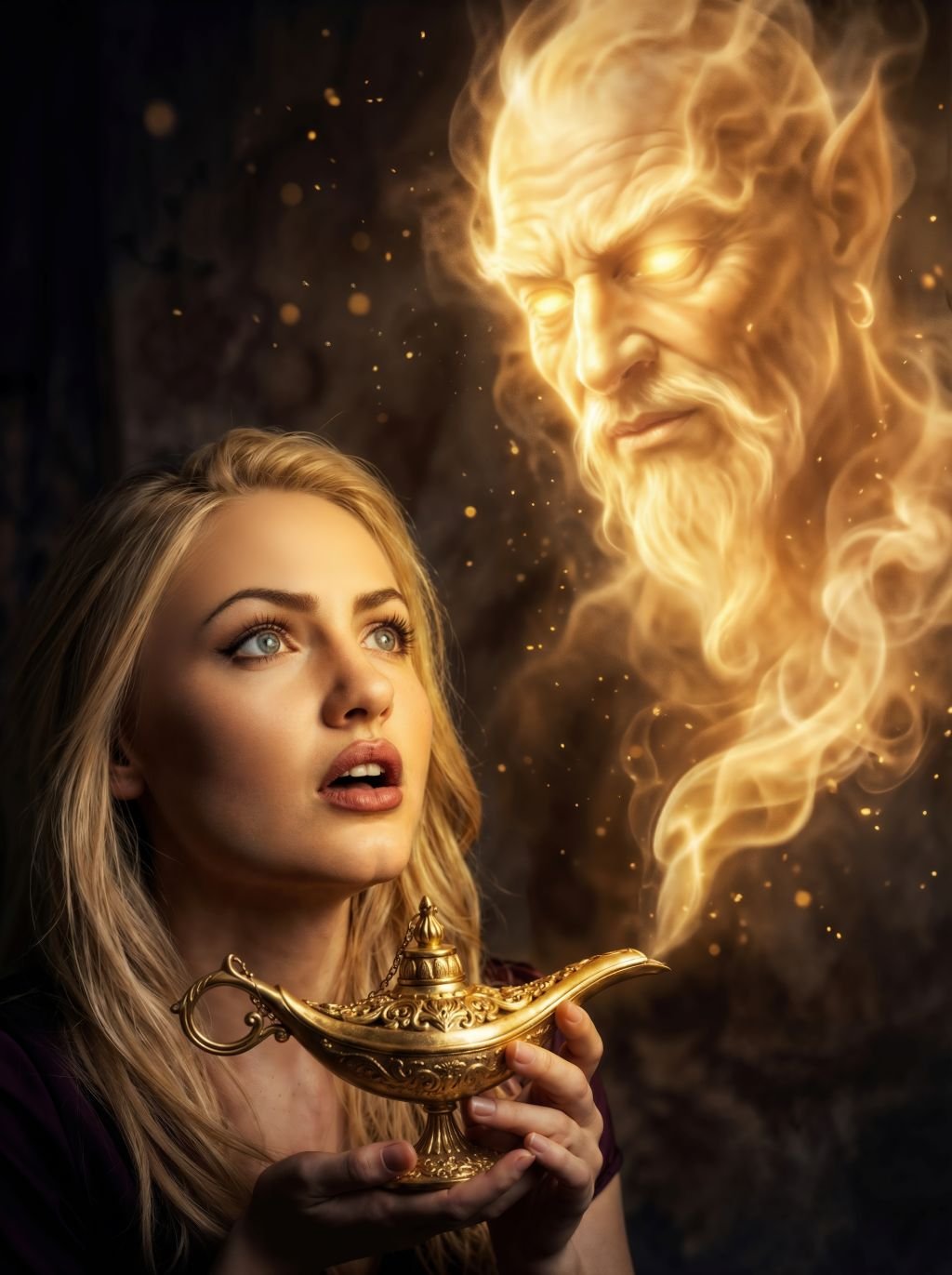 In this cinematic fantasy scene, Samantha cradles an ornate, antique lamp—its engraved metalwork catching the light like treasure fresh from a forgotten vault. The moment she raises it, the air ignites: warm, ember-dusted smoke unfurls and shapes itself into a towering, luminous Djinn—an ancient face carved from flame and fog, eyes glowing with otherworldly power. It’s awe, danger, and wonder in one breath.