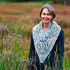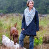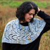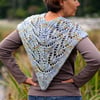 A generous triangular lace cowl that can be whipped up in no time. Begin at the point of the triangle and work up to the neck. Split for the neck and simply work straight in pattern, then seam closed at the back.