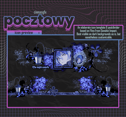 An elaborate icon template & post divider based on Flins from Genshin Impact, as requested by anonymous on tumblr. There's no blockquotes, but it should be wide enough to cover the post width. The image used in the preview is not included with the psd file. Easy to edit if you're familiar with the following: layer styles and layer masks.