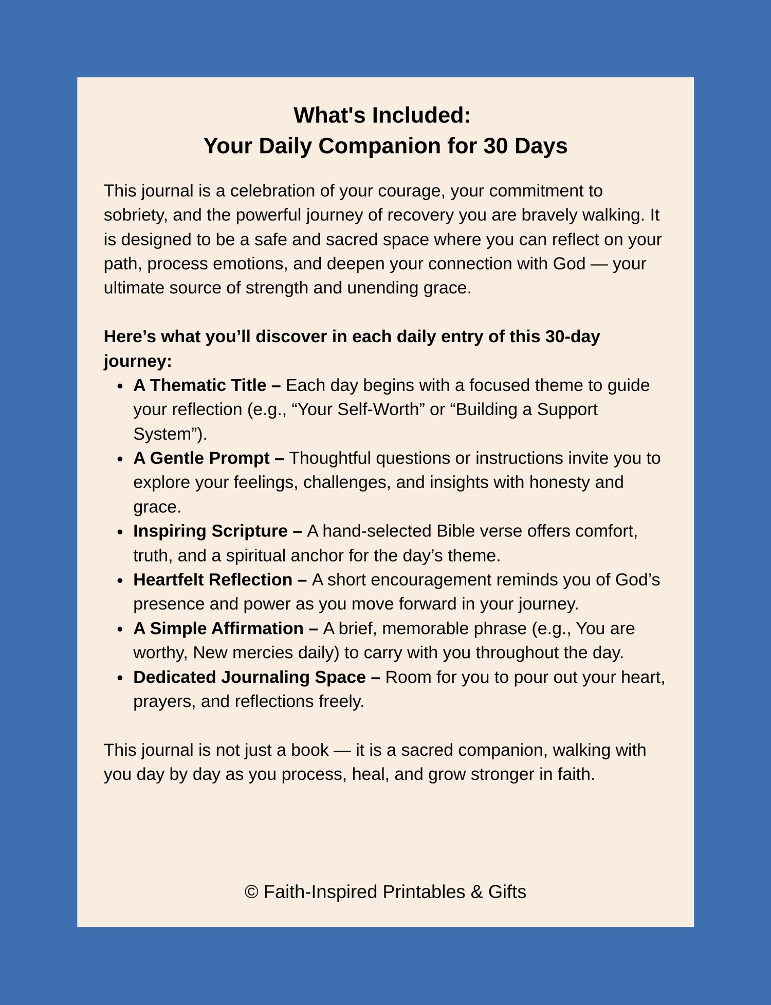 This journal is a safe and sacred space to reflect on your path, break free from shame, and deepen your connection with God — your ultimate source of strength, renewal, and grace.