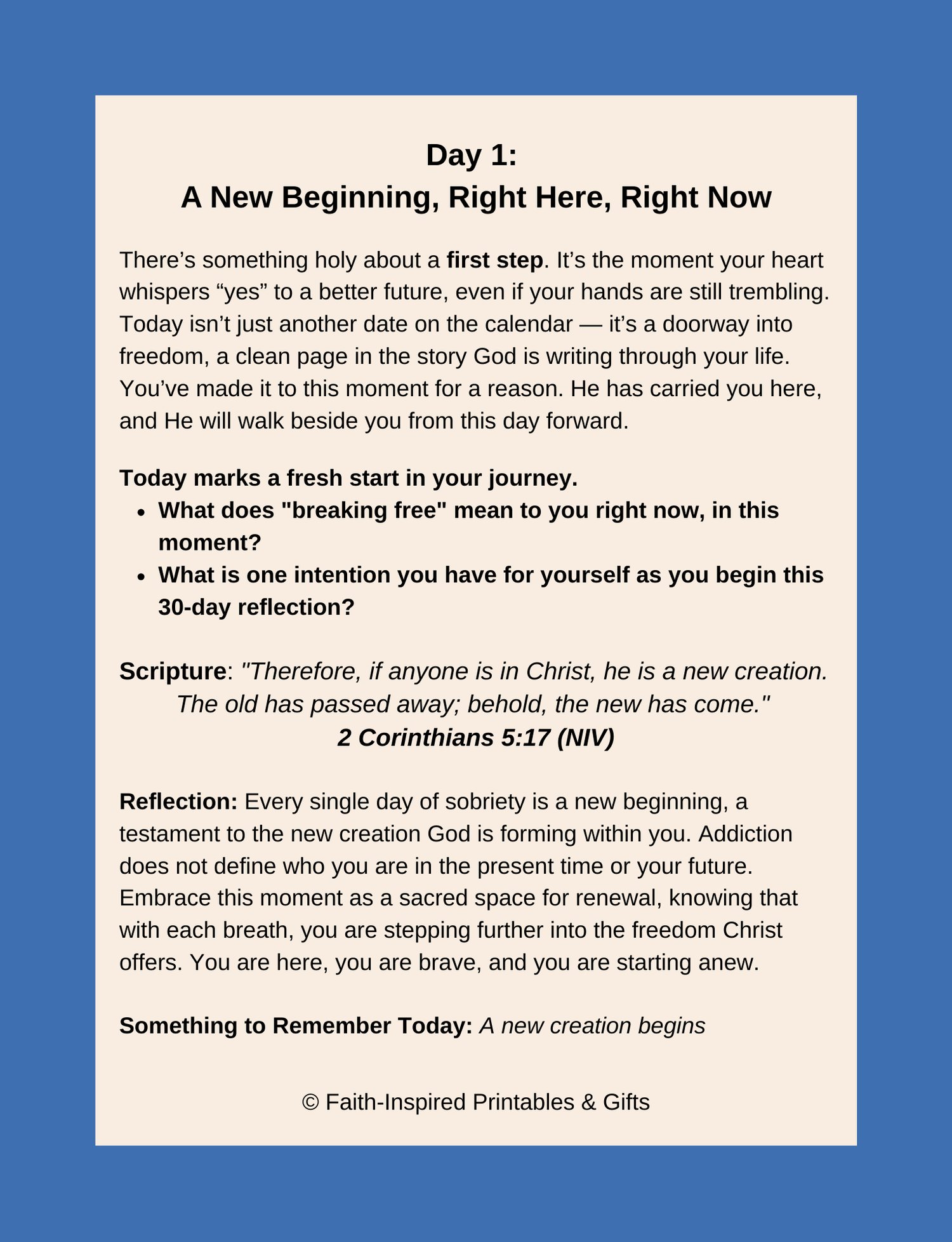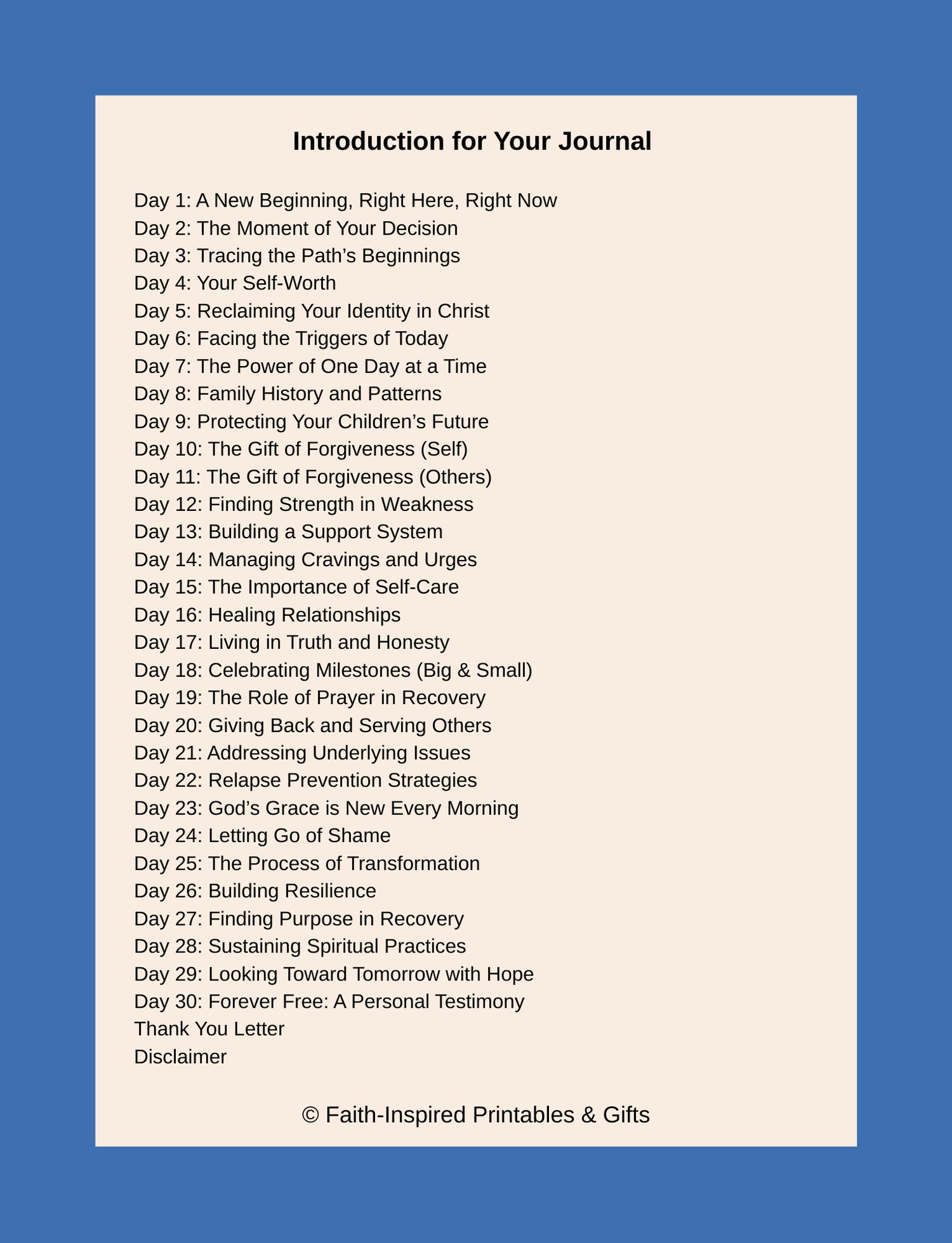 This faith-based recovery journal is a companion for those walking the courageous path of sobriety and healing from drug addiction. Over the course of 30 days, you’ll be guided through themes of self-worth, forgiveness, resilience, and hope — all anchored in Scripture and gentle encouragement.