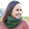 This cowl is knit flat and joined into a loop at the end with a three-needle bind-off.